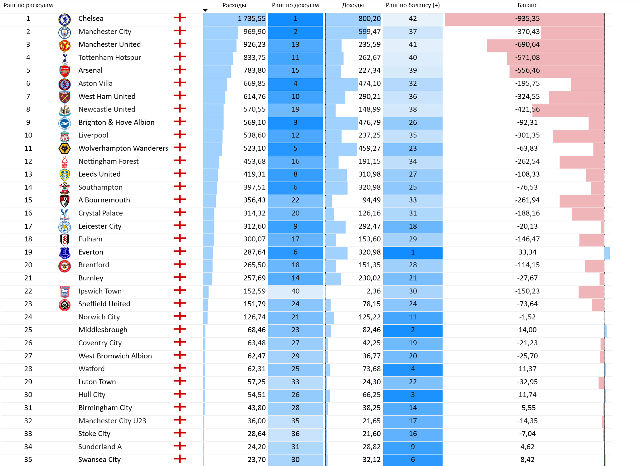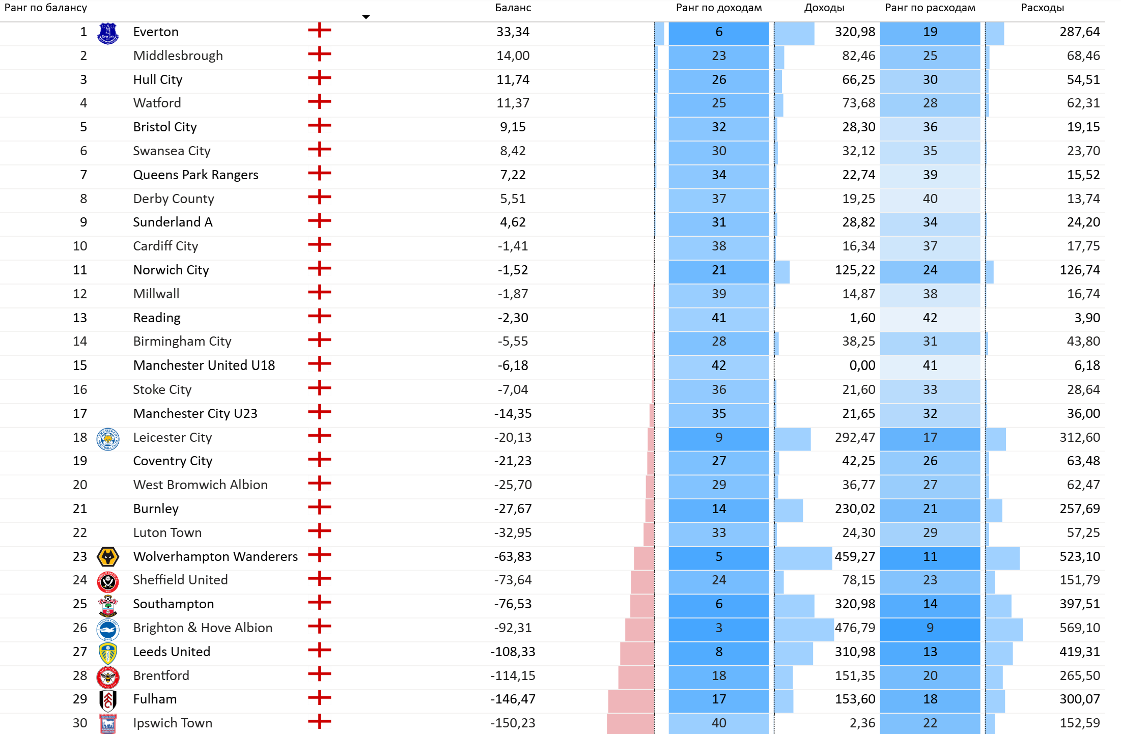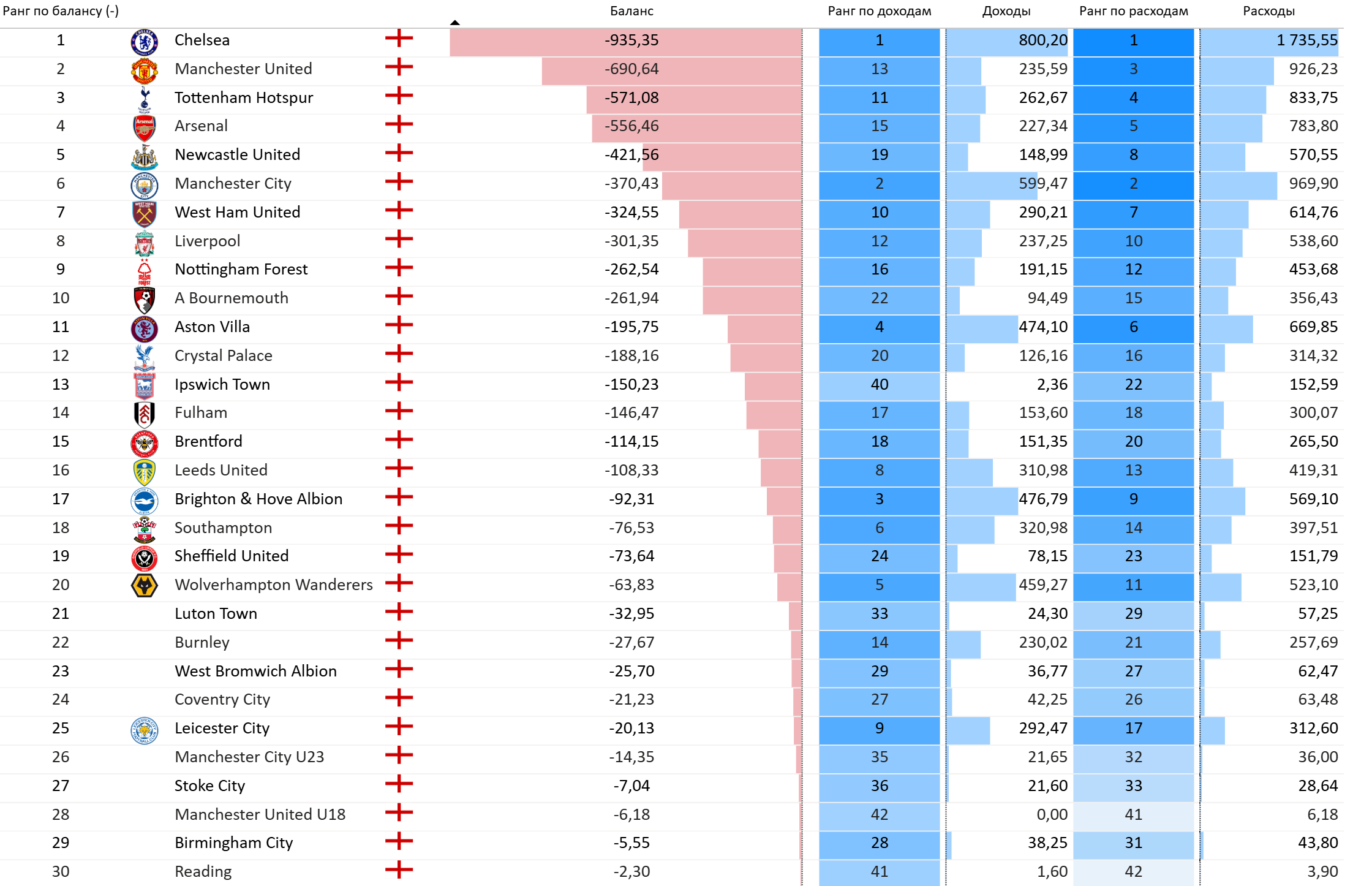 Рейтинг клубов Англии по худшему трансферному балансу 2020-2025
