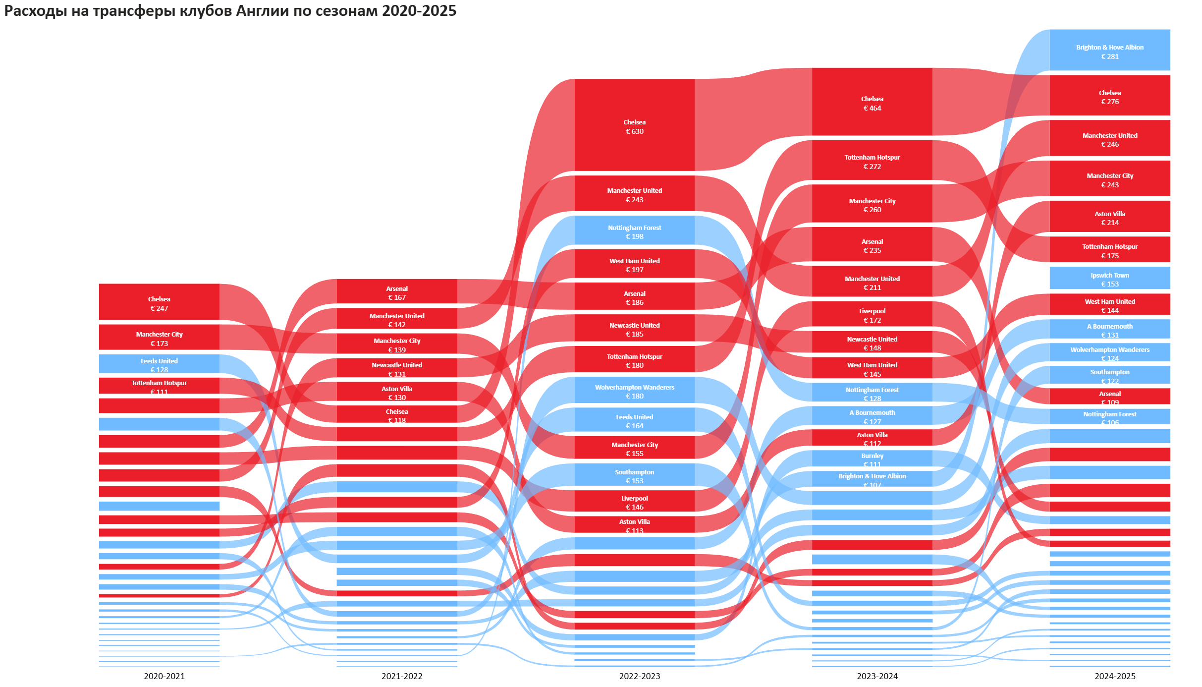 Расходы на трансферы клубов Англии по сезонам 2020-2025
