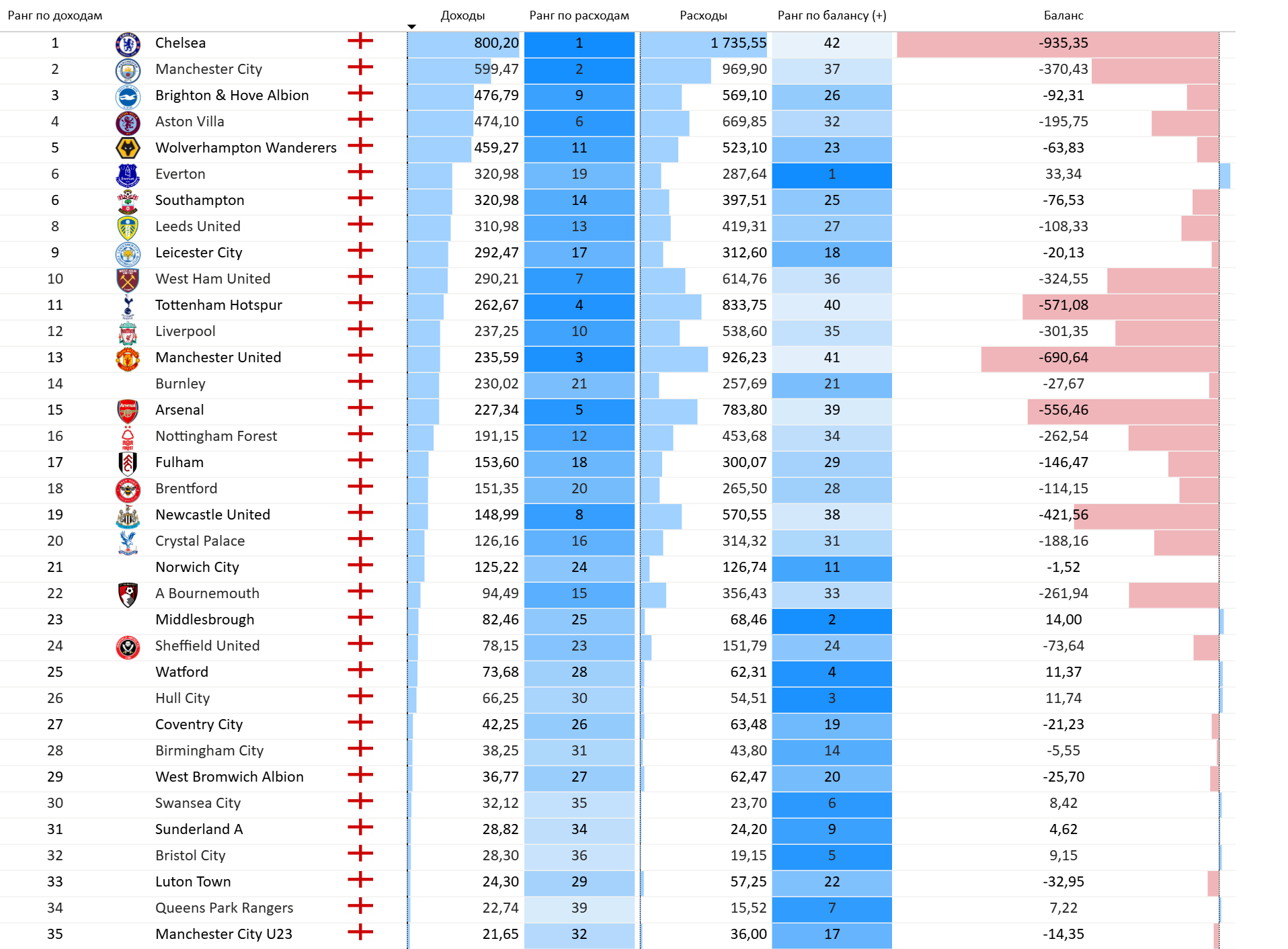 Рейтинги клубов Англии по трансферным расходам и доходам за последние 5 сезонов