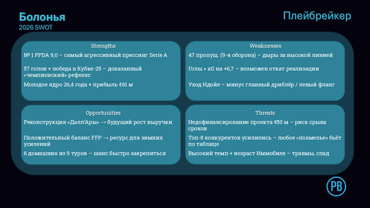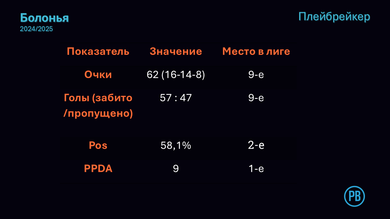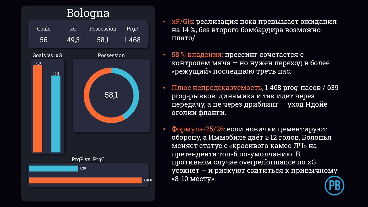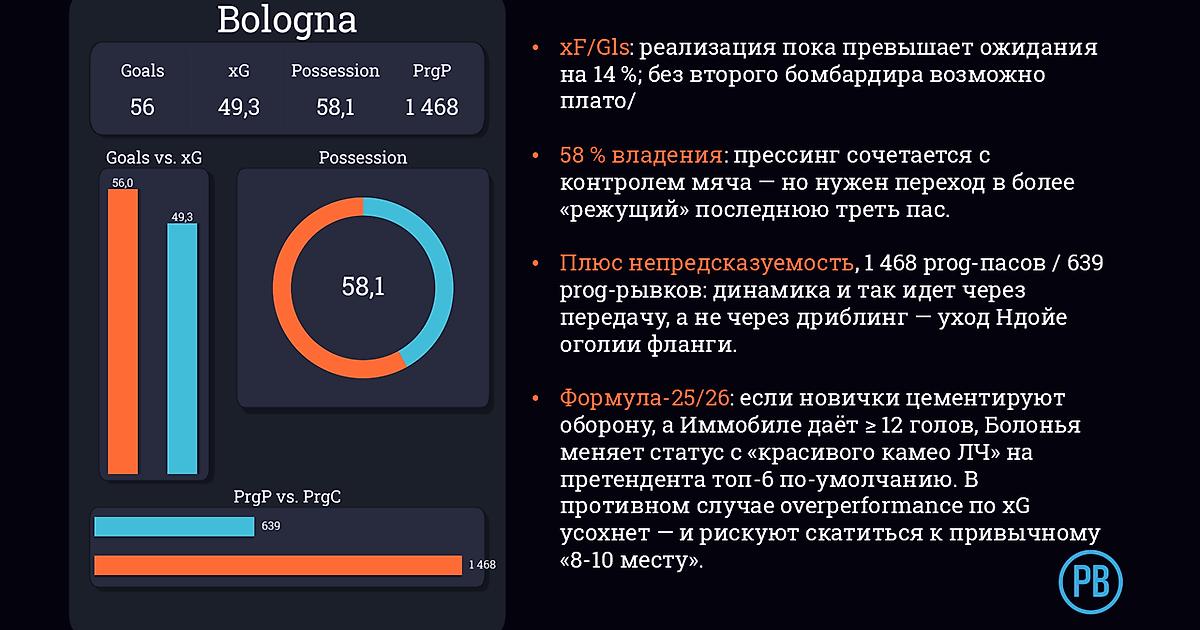 - Прессинг как визитка. 9,0 PPDA держит «Болонью» в элите по интенсивности - но требует хирургически точного позиционирования новых ЦЗ (Казале, Витик).
