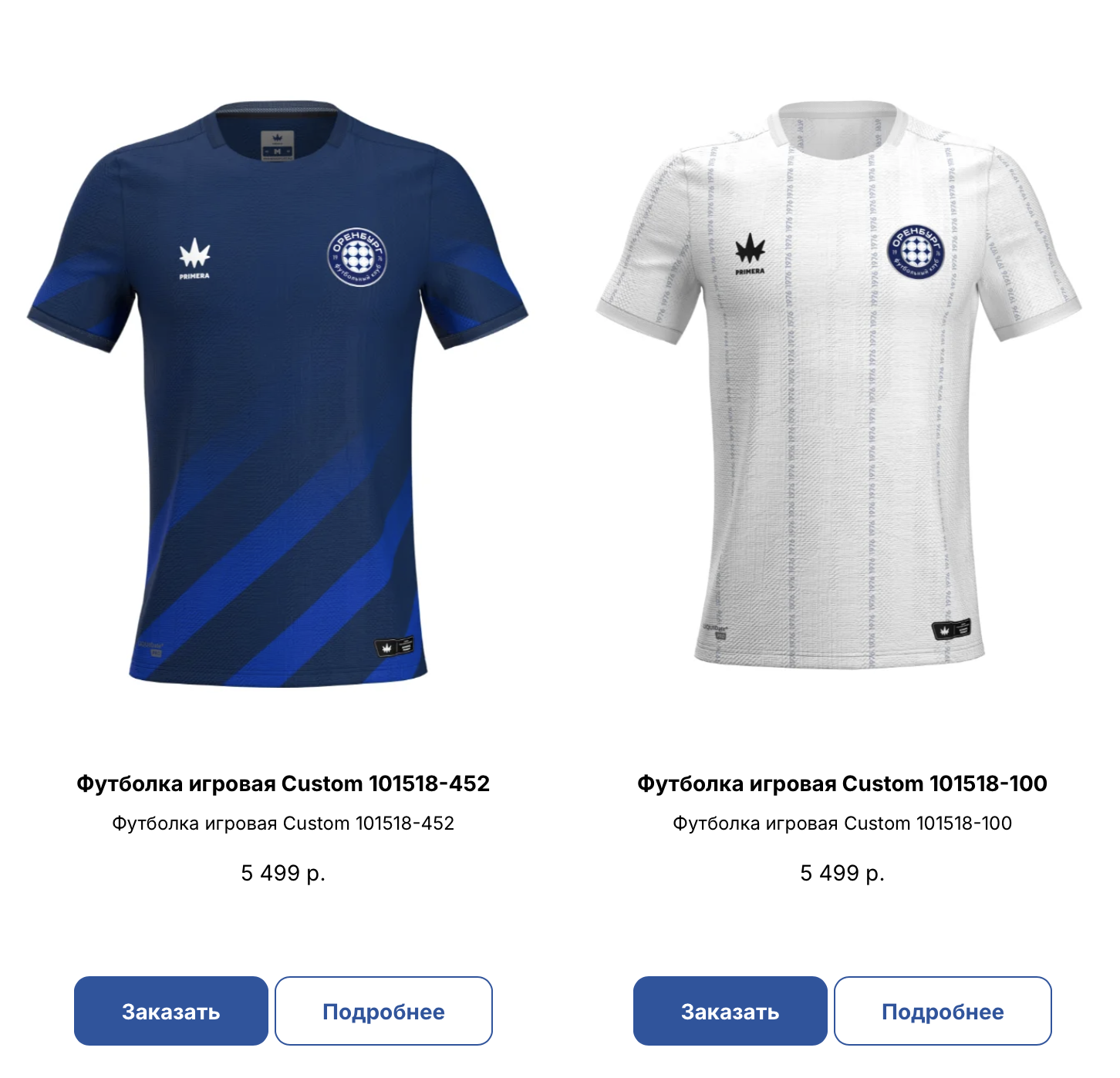 У «Оренбурга» в интернет-магазине продается форма компании Primera, но неизвестно, точно ли это официальная экипировка на сезон-2025/26. На сайте комплекты называются “Custom 101518-452” и “Custom 101518-100”.