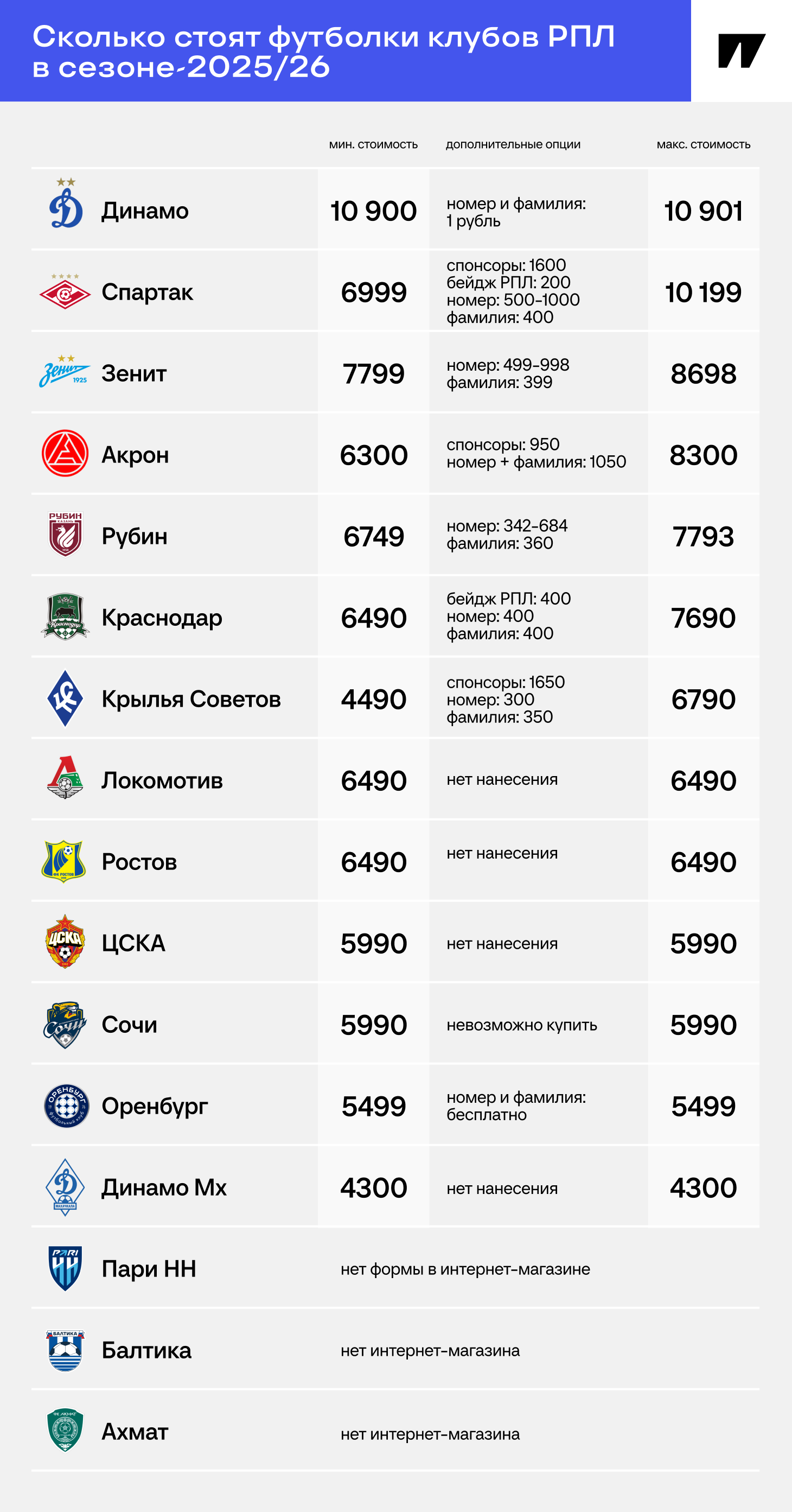За последние 5 лет футболки большинства клубов РПЛ подорожали. Например, форма «Динамо» без нанесения и спонсоров стоила 5990, а теперь – 10900, «Рубина» – 6749 вместо 5990, «Краснодара» – 6490 вместо 5990, «Ростова» – 6490 вместо 4900, а «Сочи» – 5990 вместо 4100.