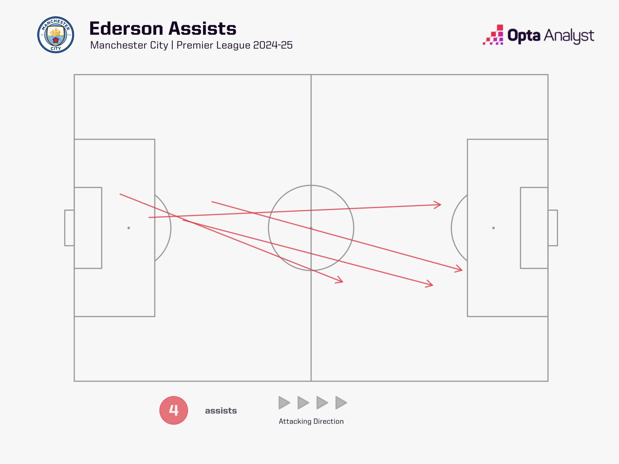 Кроме того, фирменный навык Эдерсона – игра ногами – проявился как никогда ярко: 4 голевые передачи в сезоне 2024/25 сделали его первым вратарем в истории Премьер-лиги, отдавшим более двух ассистов за один чемпионат.