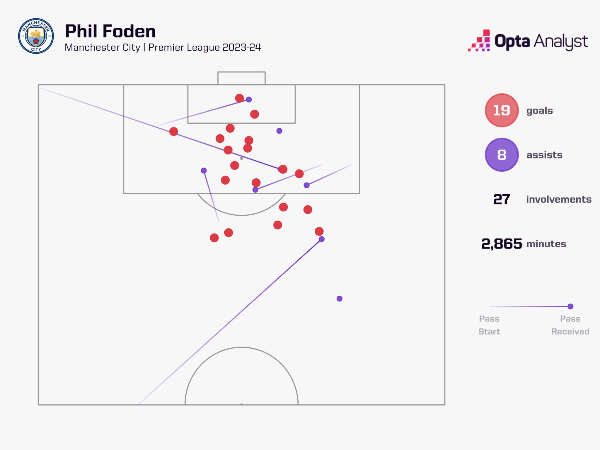 Несмотря на неудачный сезон, Фоден остается игроком высочайшего класса. Еще в 2023/24 он поучаствовал в 27 голевых моментах АПЛ — показатель, о котором большинство полузащитников и вингеров могут только мечтать.