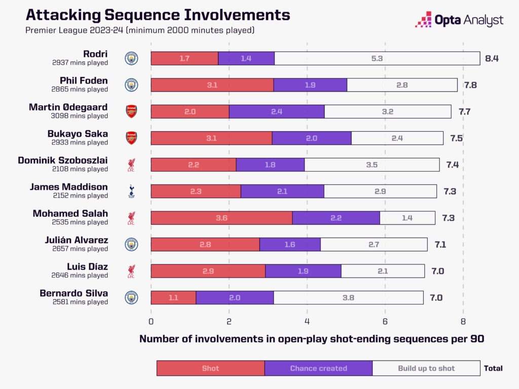 Среди всех футболистов АПЛ только Родри делал в среднем более 100 успешных передач за игру (103). Он также лидировал по количеству касаний мяча (126 за 90 минут), опережая ближайшего партнера по команде на 24.