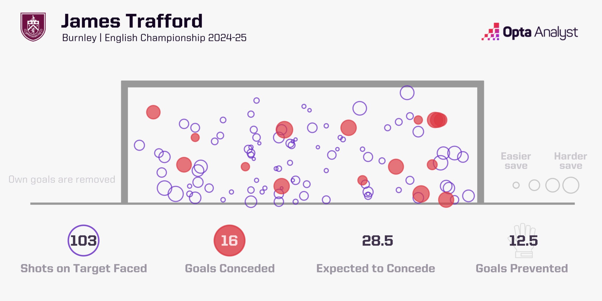 В Чемпионшипе лучший результат в этом компоненте был только у Виктора Йоханссона из «Сток Сити» (15.8), но при этом шведский вратарь отразил значительно больше ударов в створ (214 против 103 у Траффорда), что давало ему больше возможностей проявить себя. Этот прогресс свидетельствует о значительном росте мастерства английского голкипера, который теперь готов конкурировать на высшем уровне.