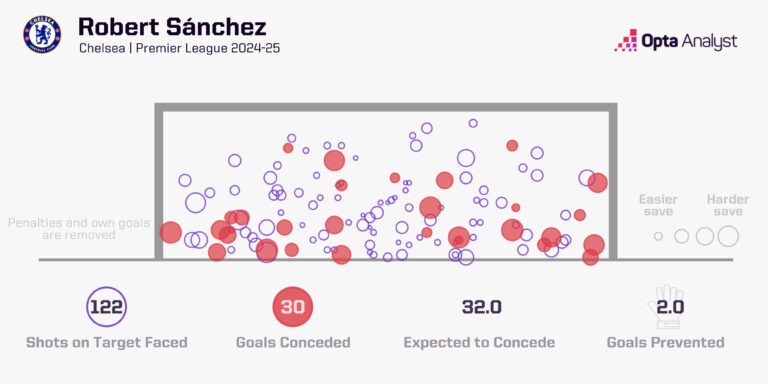 При этом Санчес более надежный вратарь, чем принято считать. Согласно данным по xGOT (ожидаемым голам по ударам в створ), он отразил на два гола больше, чем среднестатистический вратарь. Для «Челси» это редкое достижение в последние годы: его показатель +2.0 по отражённым ударам стал вторым лучшим среди вратарей клуба за последние восемь сезонов.