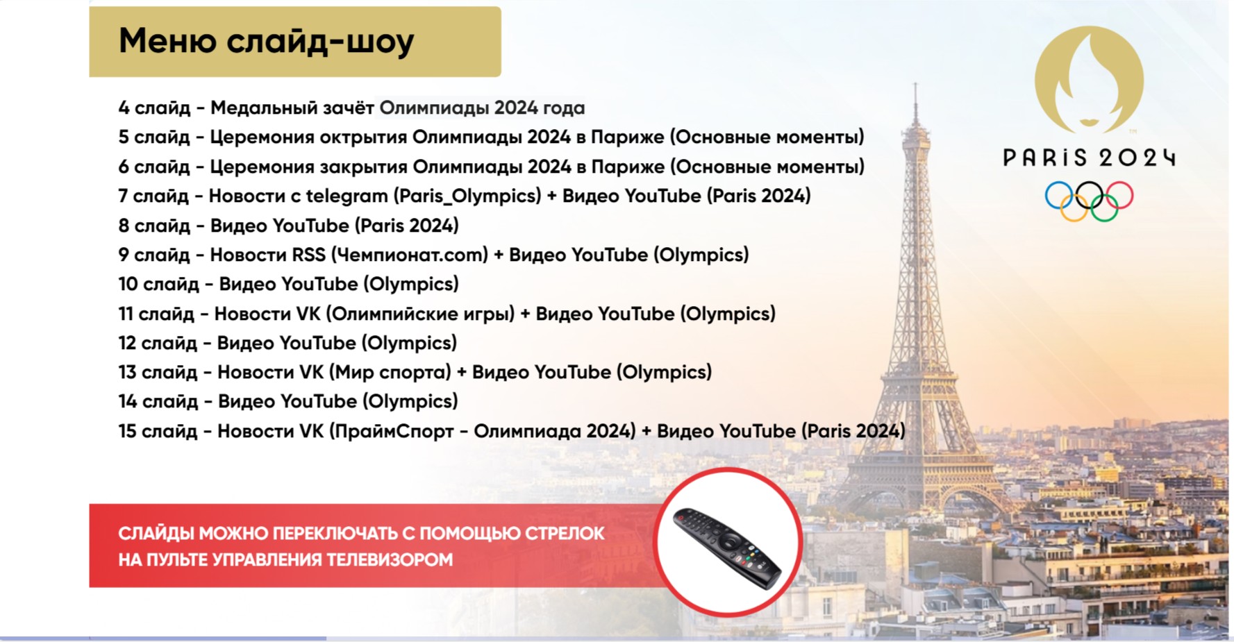 В этой статье мы хотим познакомить вас с возможностями применения интерактивного слайд-шоу, цифрового контента в спортивной сфере. Основное преимущество – возможность удобной трансляции на Smart TV текущих соревнований, матчей, громких событий в мире спорта, просмотра видеороликов и ленты социальных сетей, информации по спортсменам, достижениям, спортивным результатам. Дополнительные плюсы - возможности интеграции актуальной погоды, текущего времени, карты пробок на дорогах и много другого.