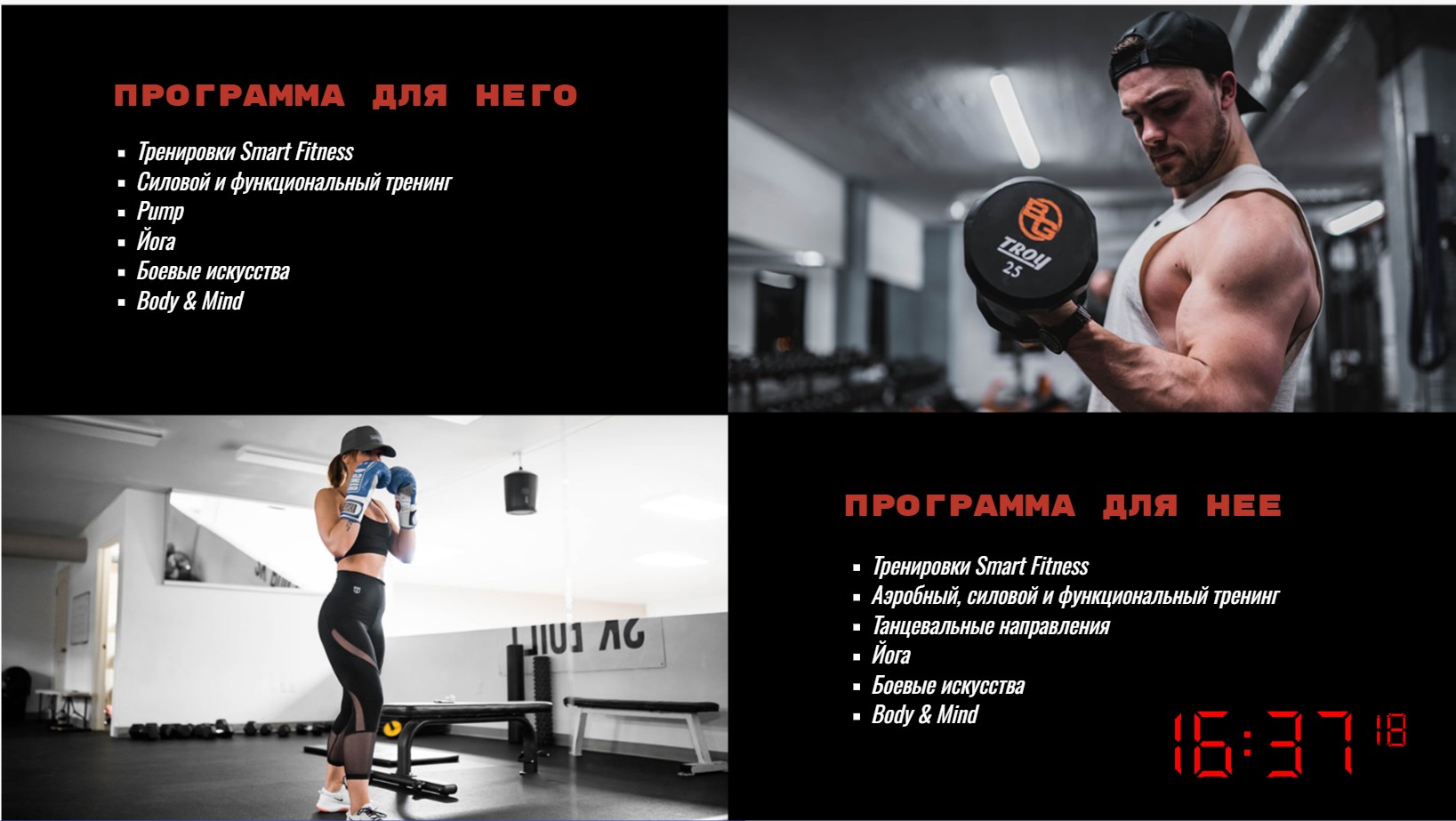 Телевизор c трансляцией слайд-шоу для фитнес клуба можно разместить в зоне ресепшена, кардио-тренажеров, фитнес бара или кафе.