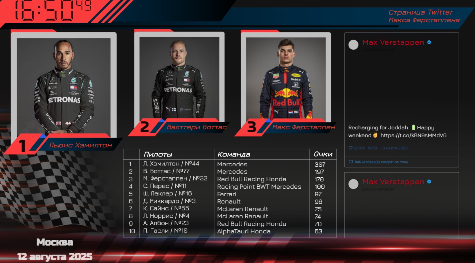 - Интегрировать таблицы как на скриншоте ниже: пилоты, команды, очки.