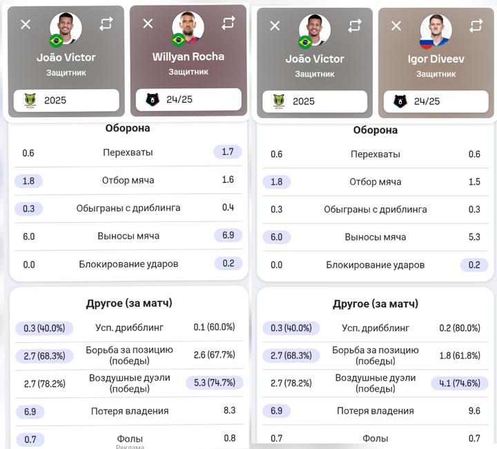 Если же сравнивать Виктора с Дивеевым, то Игорь гораздо результативнее, чаще бьет по воротам и лучше действует в воздухе. Зато Жоао превосходит его по среднему количеству перехватов, выносов, меньше теряет мяч и лучше ведёт борьбу за позицию. В этом соперничестве, как кажется, все еще плотнее, и показатели практически идентичны.
