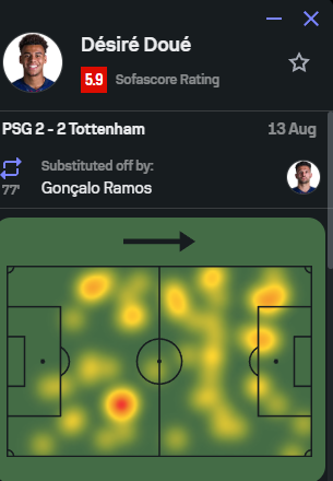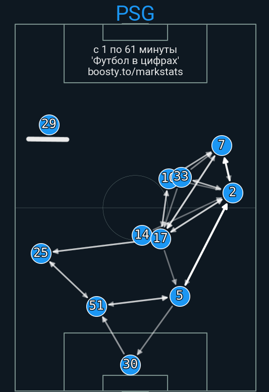 Атака «ПСЖ» оказалась обезглавлена. Через центр, учитывая работоспособность Кудуса и Ришарлисона, шансов пройти оборону соперника у «ПСЖ» было еще меньше, а на противоположенном фланге Барколя оказался изолирован. Через его фланг шло всего 23% атак, и у француза всего 23 касания за 67 минут, но более показательна карта средних позиций.