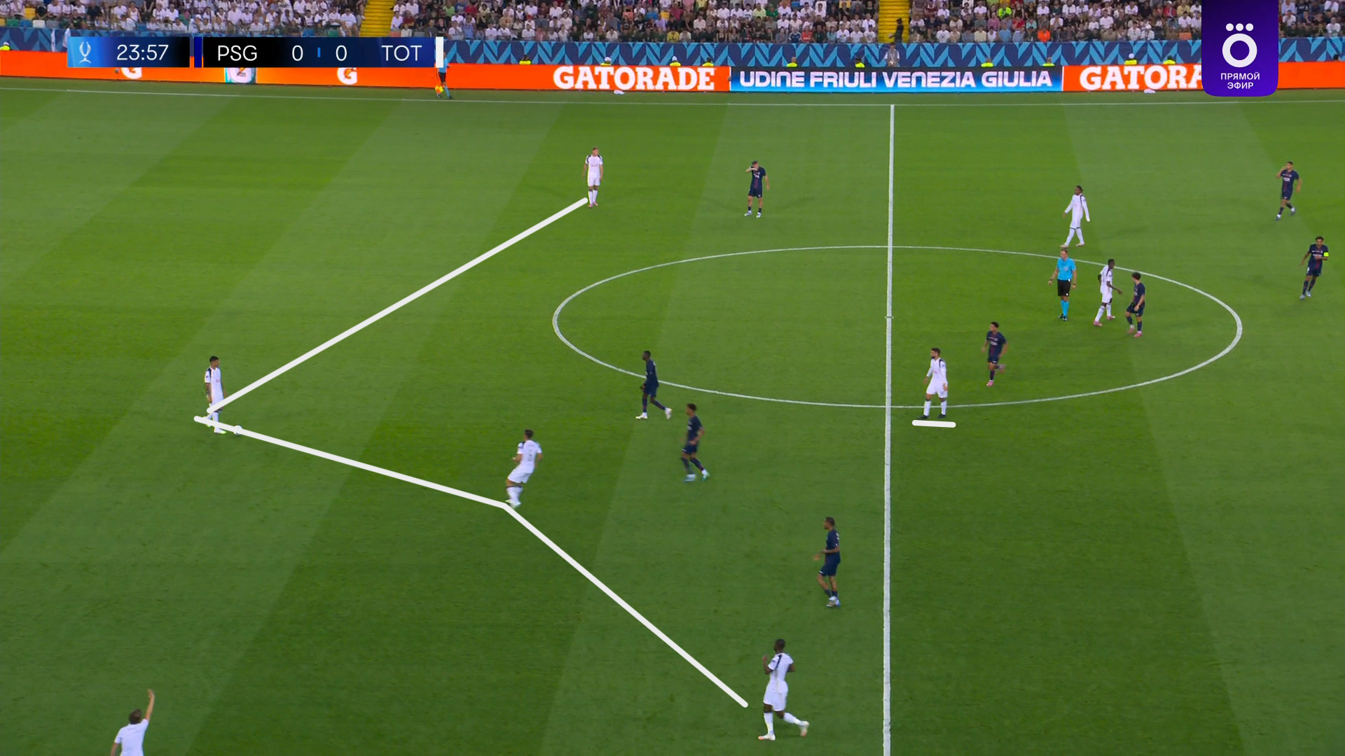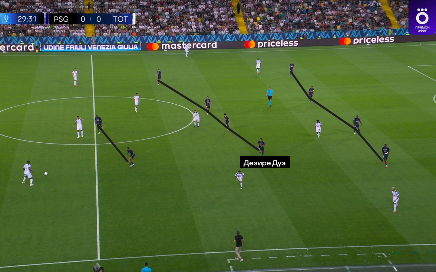 Пара форвардов здесь играет по ближайшим к мячу игрокам, треугольник Сарр-Бентанкур-Палинья действует по аналогичному триумвирату «ПСЖ» (Дуэ-Эмери-Витинья), а вингбэки Порро и Спенс выдвигаются на Медеша и Хакими соответственно.