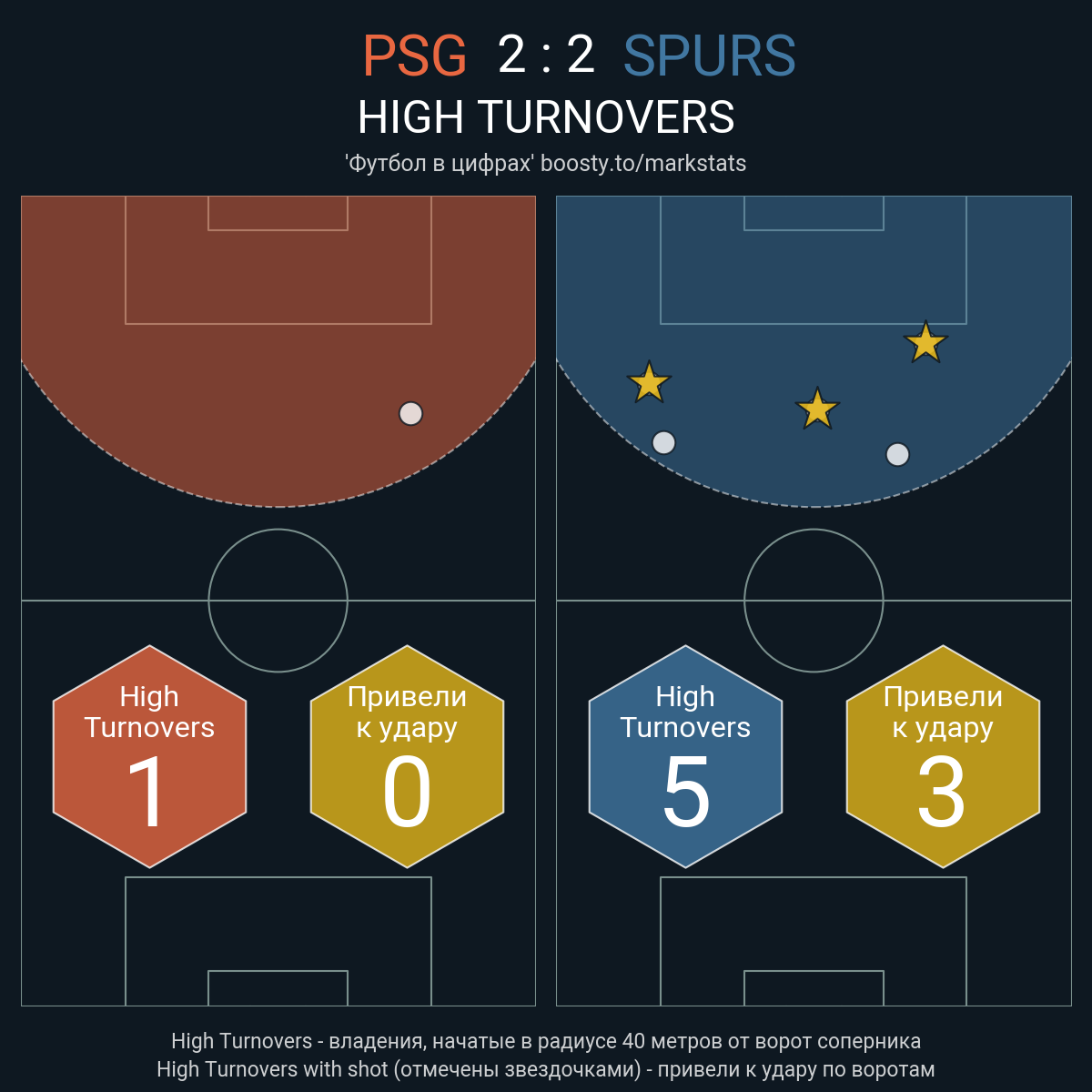 А если смотреть на высокие возвраты, то реальная картина становится видна каждому: «Тоттенхэм» разгромно переиграл «ПСЖ» в главном показателе эффективности прессинга.
