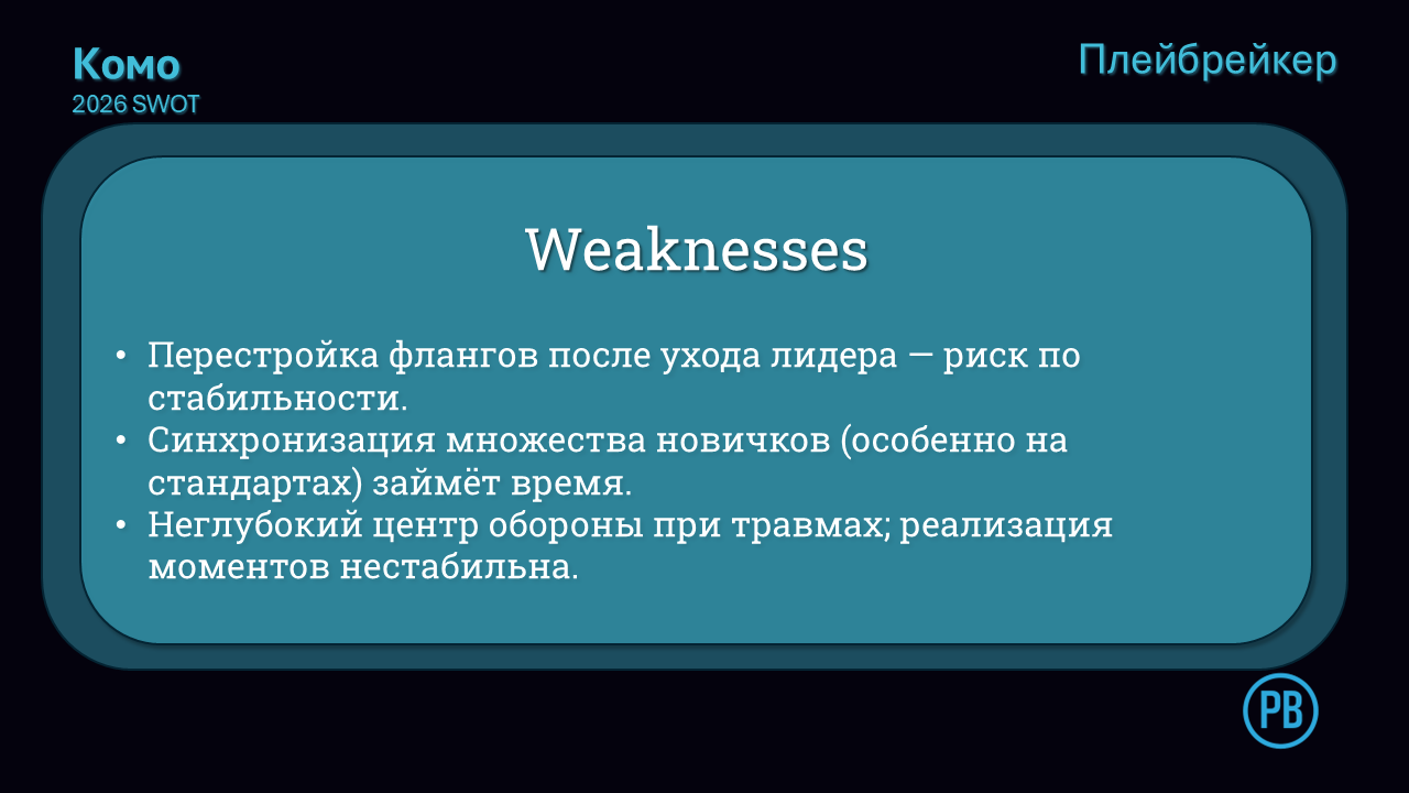- Глубина в центре обороны при травмах — зона риска (решается ротацией Ван дер Бремпта в ЦЗ).