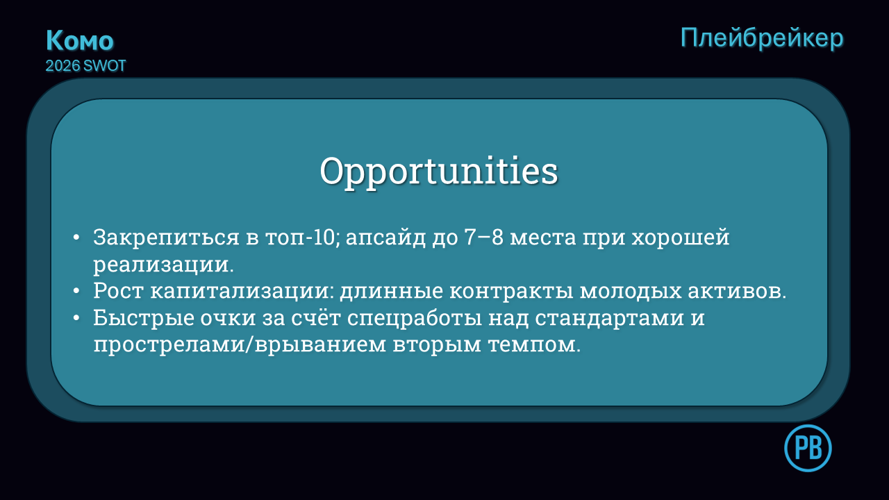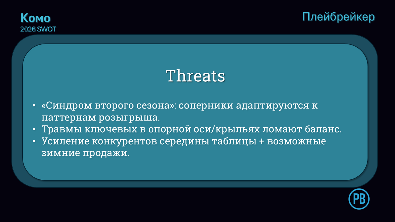 - Объём и качество последней трети (X-голов нет под рукой, но прокси-признак - лучший бомбардир всего с восемью голами). Нужно доращивать креатив и добирать прострелы/врывания вторым темпом.
