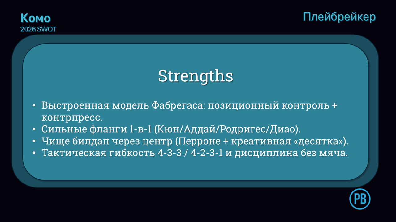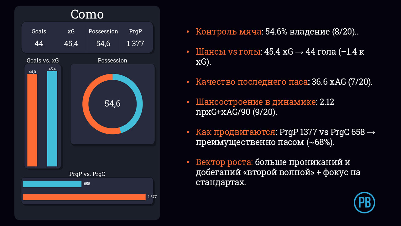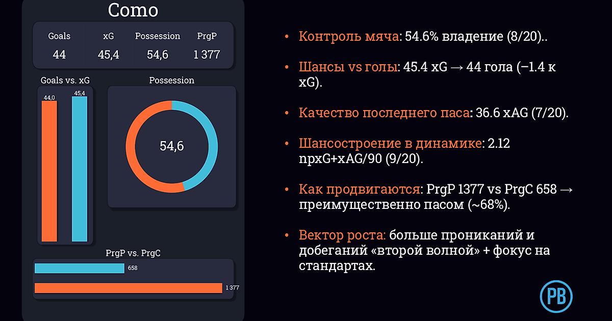 За счёт организованного давления «Комо» держал соперников на низком качестве моментов: в материалах Wyscout/Hudl клуб прямо хвалили за то, как команда «гасит» чужие удары до штрафной. Не «автобус», а наработанные триггеры прессинга и плотность в центре.