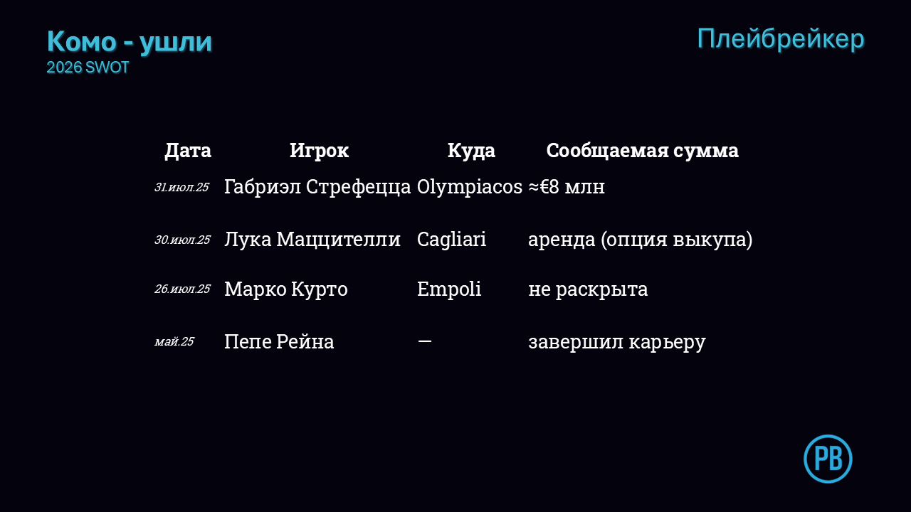 - Габриэл Стрефецца — один из лиц подъёма, но летом-2025 продан в «Олимпиакос»: клуб переформатирует крыло под новую скорость и возраст.