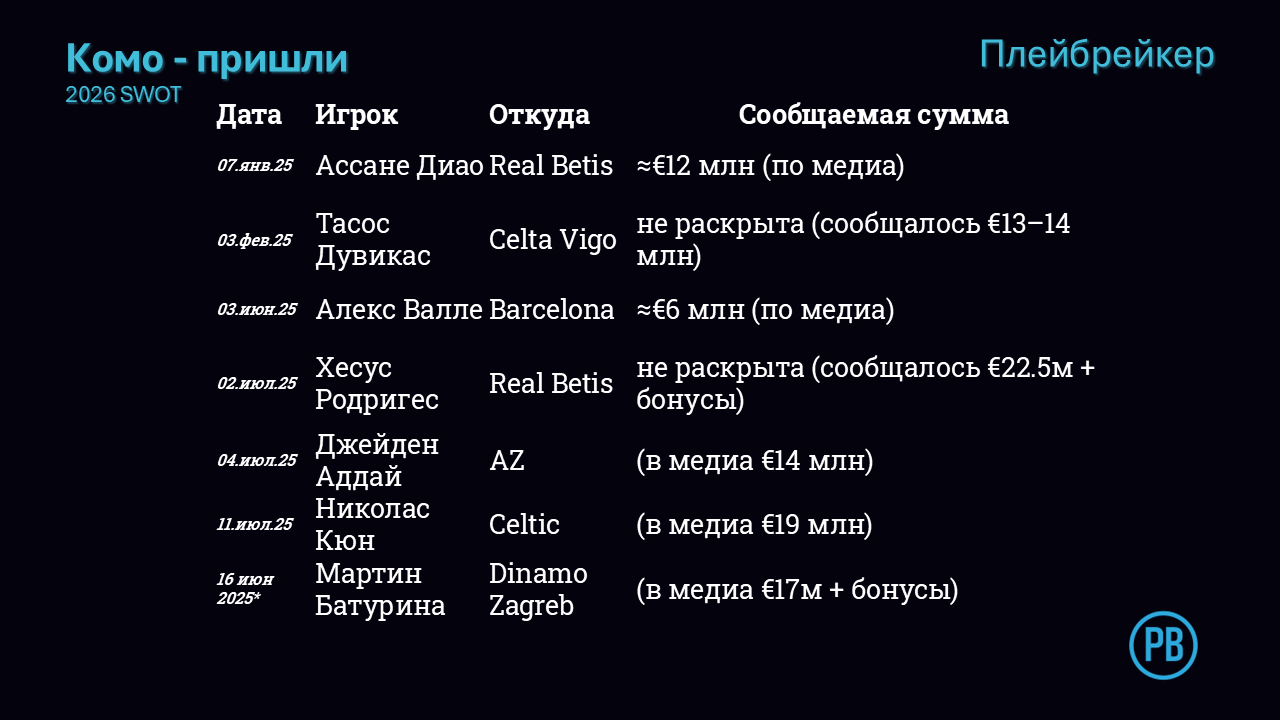 Постоянные контракты Перроне и Валле уже закрыты; клуб подтянул молодые «крылья» — Джейден Аддай (AZ) и Хесус Родригес (Бетис) на долгие сроки, делая ставку на скорость и 1v1.