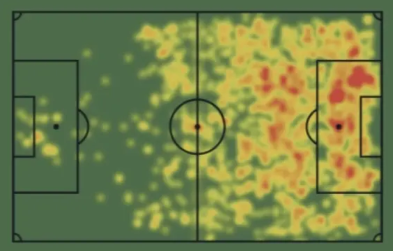 - Активность вне штрафной подтверждается тепловой картой — он стабильно уходит на фланг и участвует в переходных фазах