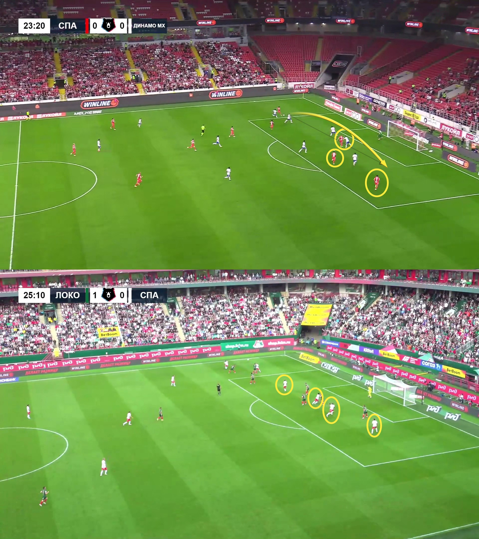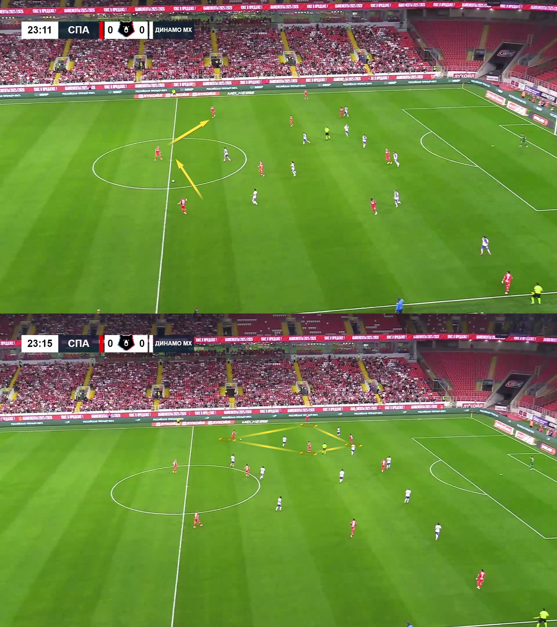 Либо «Спартак» меняет направление атак: удерживает мяч правее, затем оказывается левее – и наоборот.