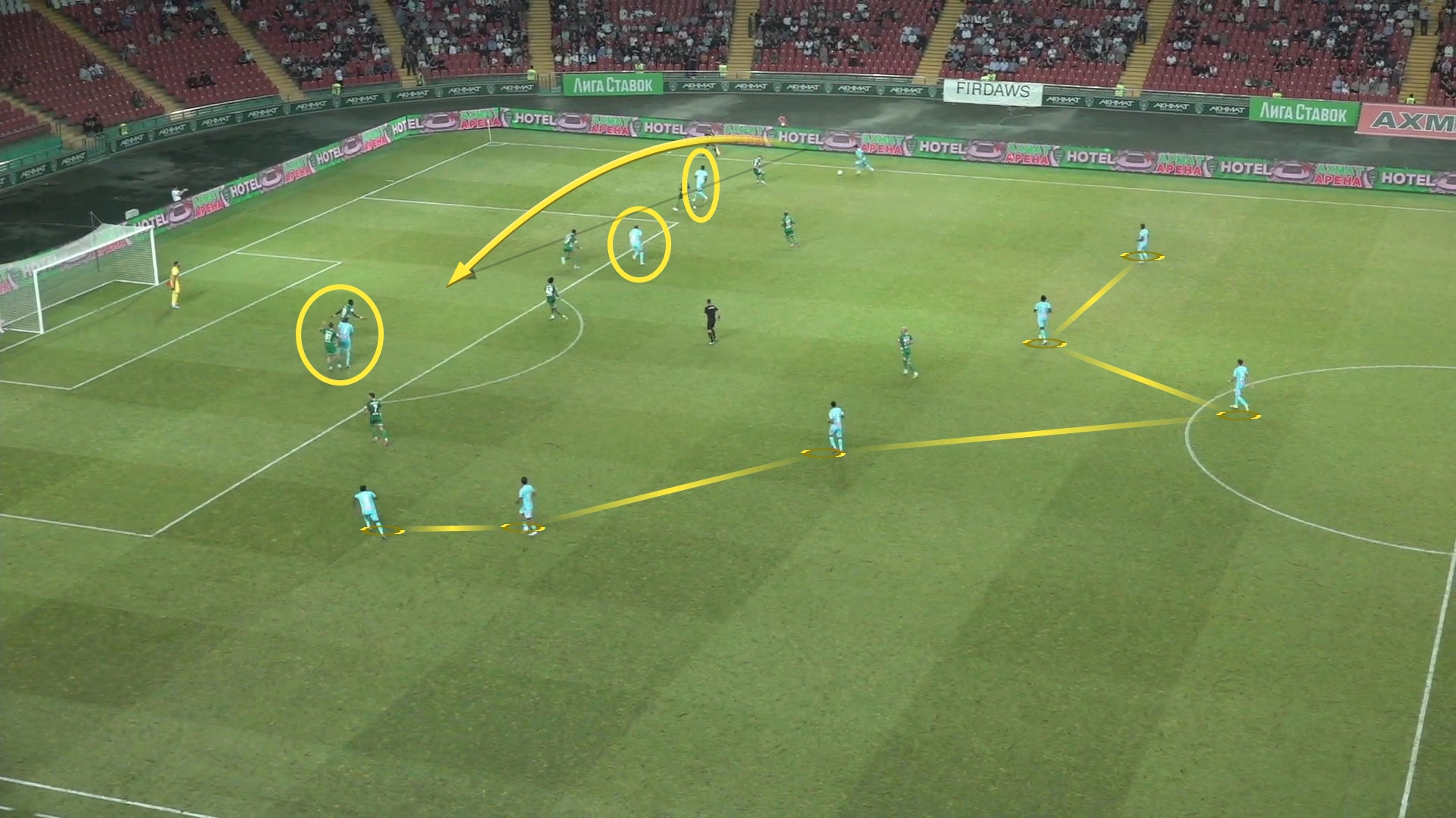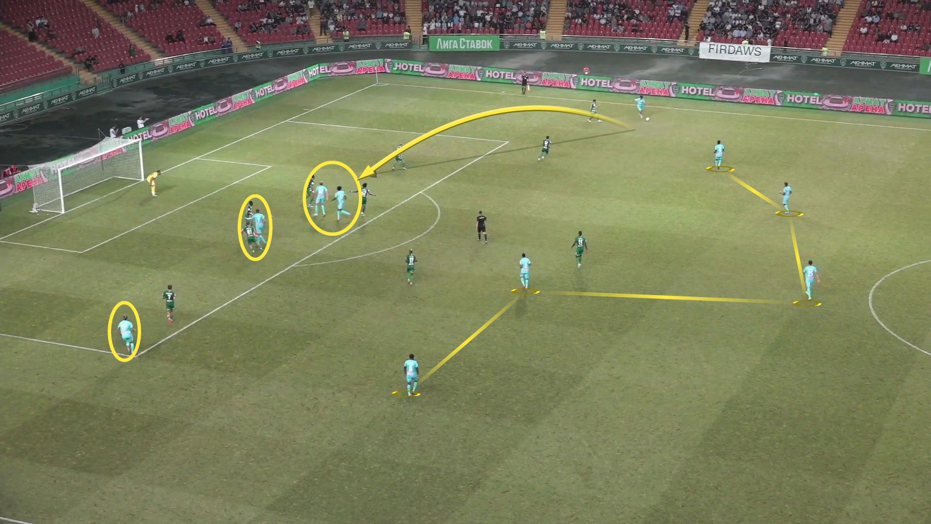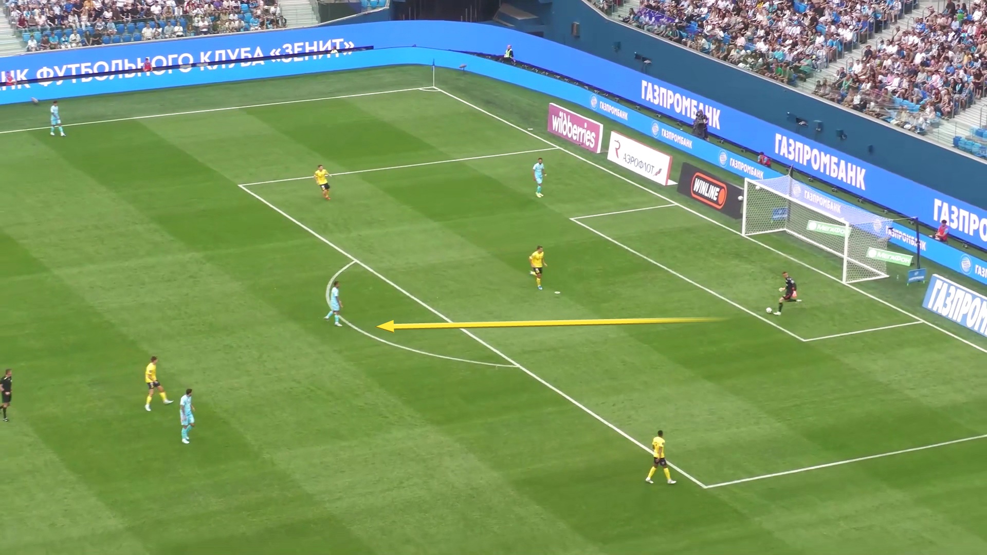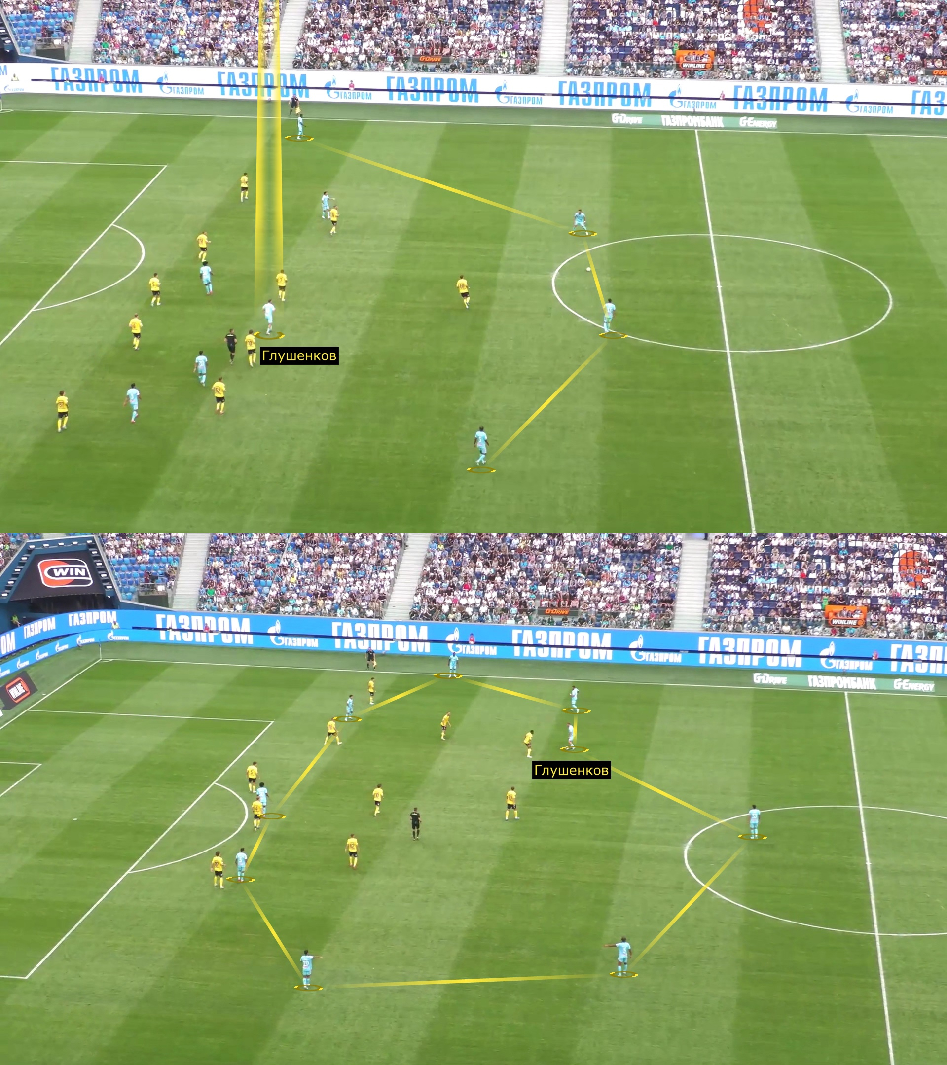 Позиционные атаки «Зенита» строятся через передачи центральных защитников справа – налево и слева – направо. Они не используют проникающие пасы на опорников или игроков между линиями. Поэтому Глушенков часто остается без мяча и отходит назад.
