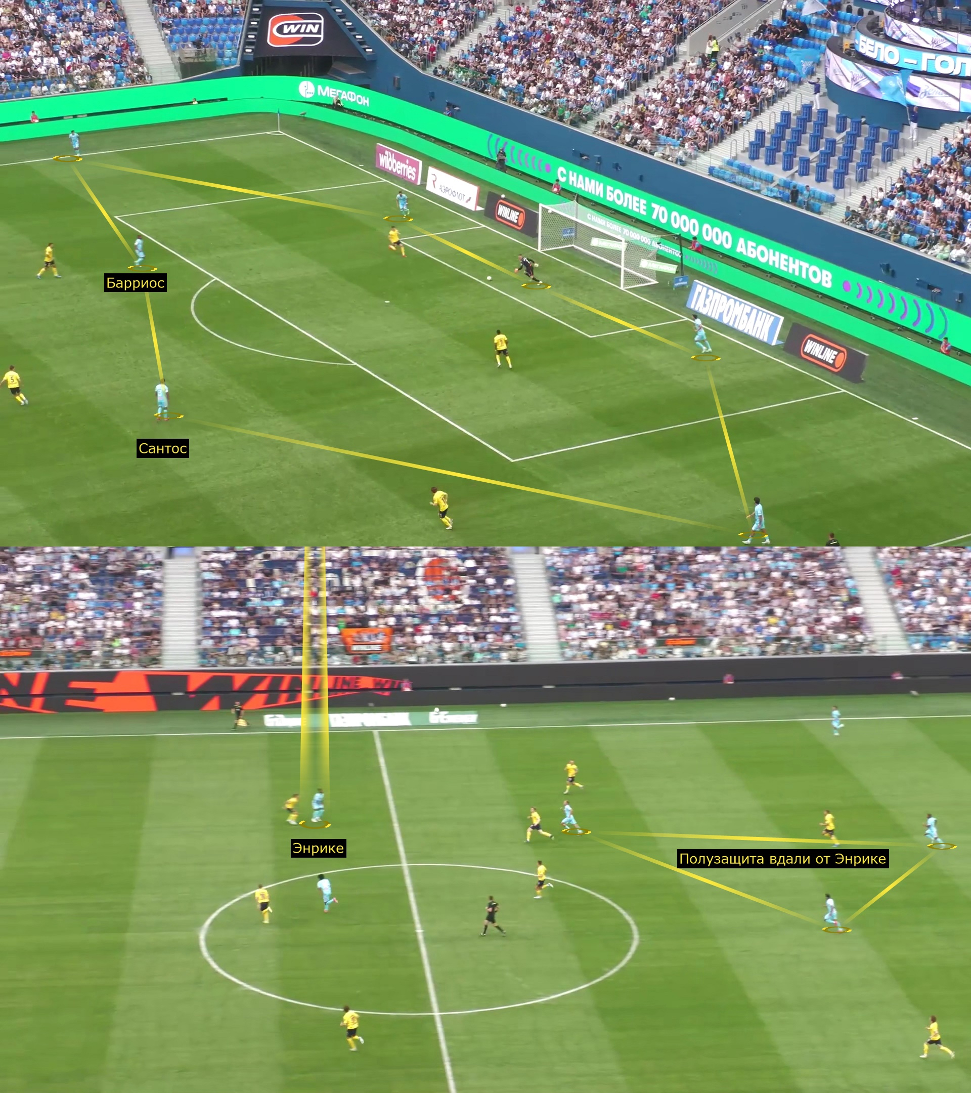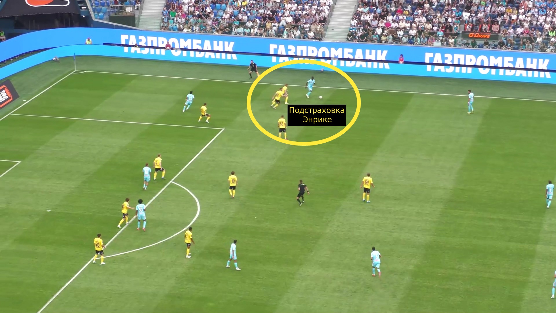 На скриншоте подсвечено: «Зенит» численно превосходит «Ростов», вратарь Латышонок может чисто ввести мяч, но Евгений делает длинную передачу на Энрике, при этом центральные полузащитники не подстраиваются под вынос – то есть не взаимодействуют в этом эпизоде, а дальше «Зенит» теряет мяч.