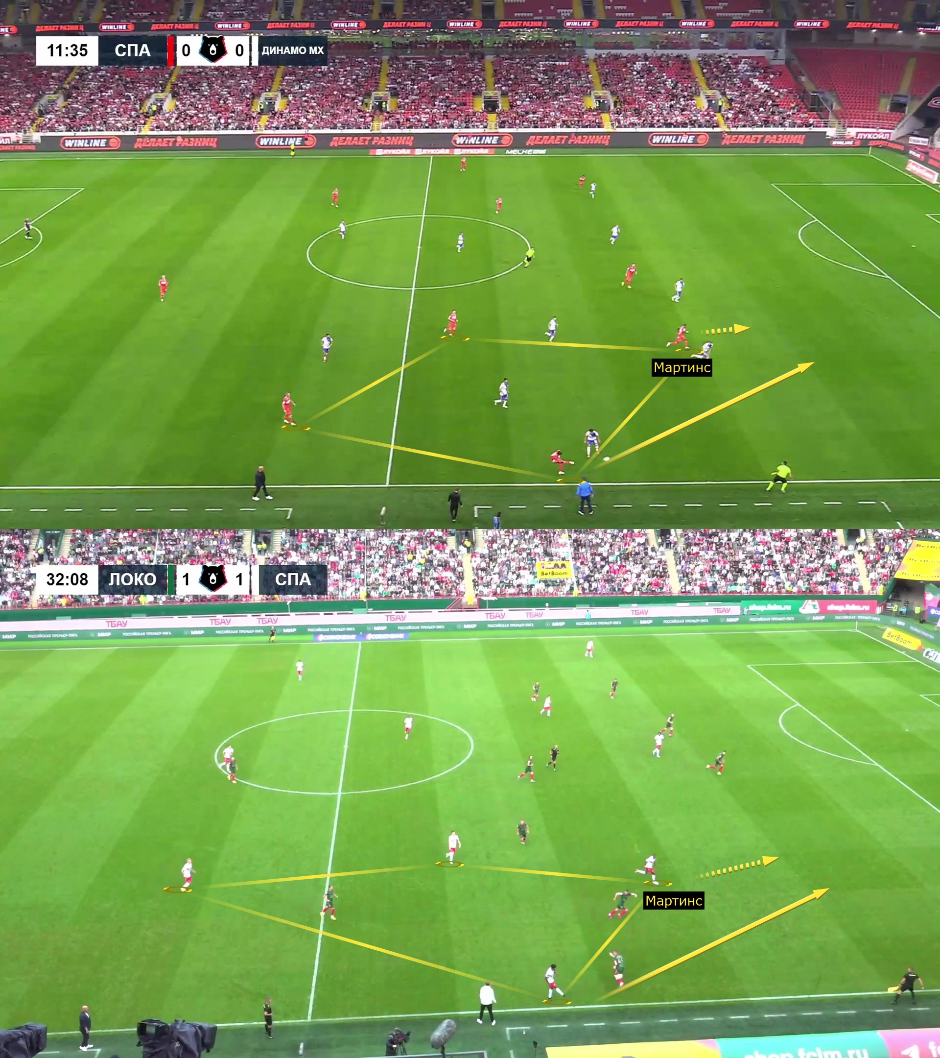 «Спартак» хорошо насыщает штрафную: в ней взаимодействуют сразу несколько игроков. Маркиньос слева работает лучше, чем Солари справа. Бразилец заходит в центр, у него отличные передачи, которые становятся результативными.