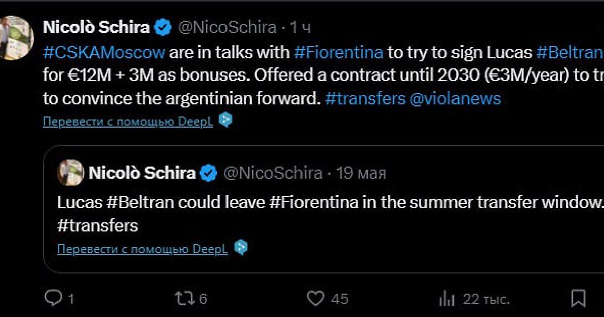 ЦСКА предложил за Лукаса Бельтрана 12 млн евро + 3 миллиона евро в качестве бонусов. Контракт до 2030 года с зарплатой 3 миллиона евро за сезон.