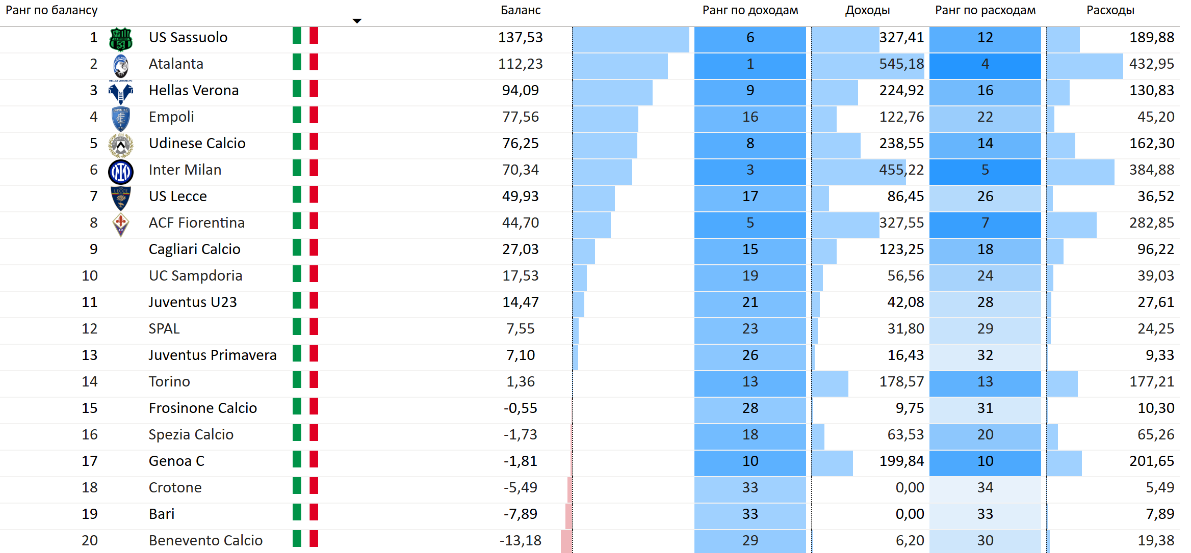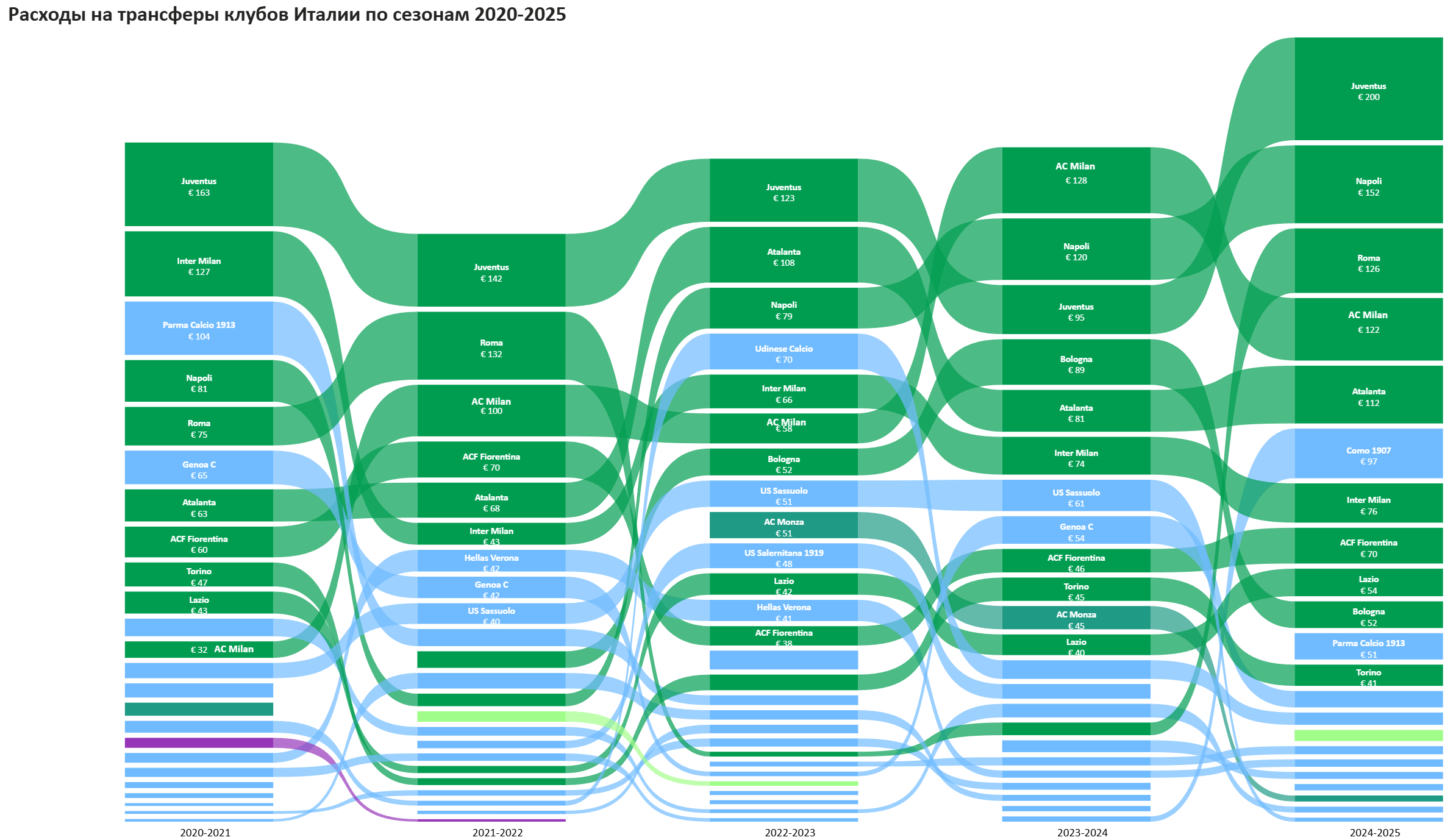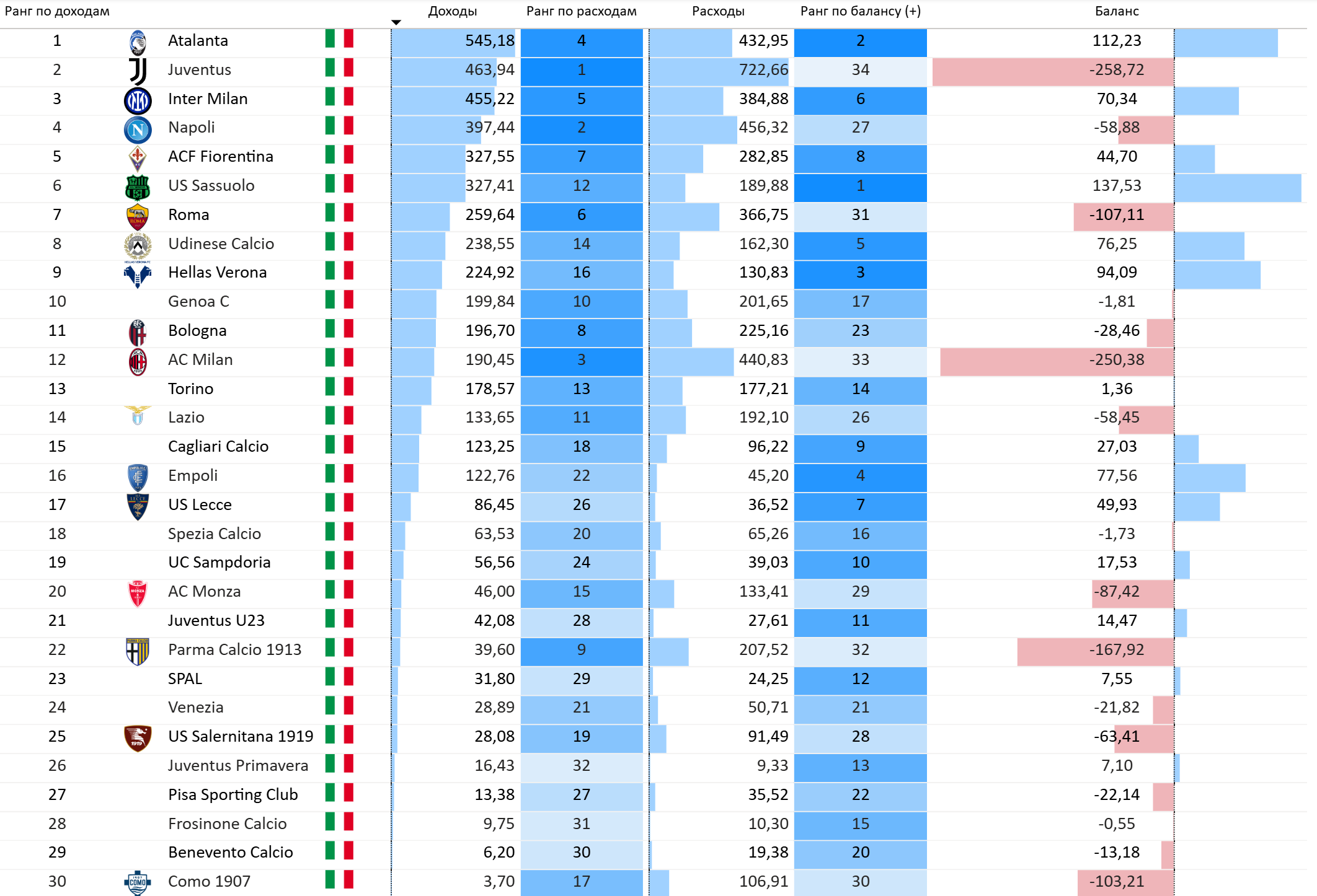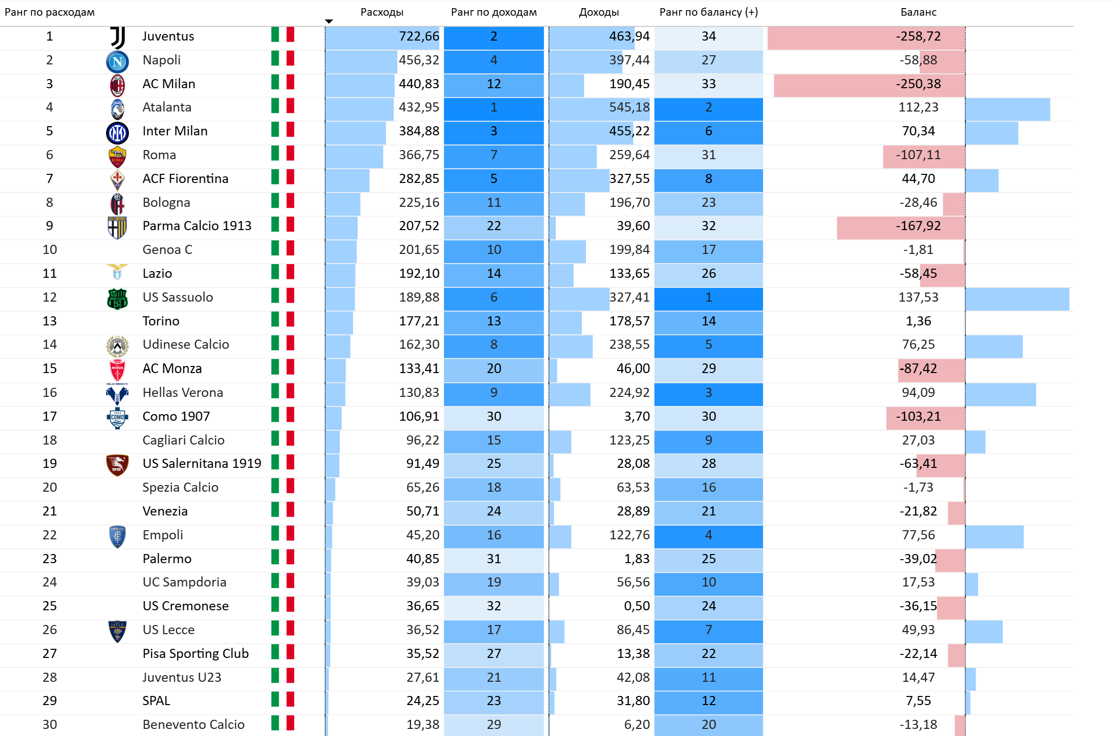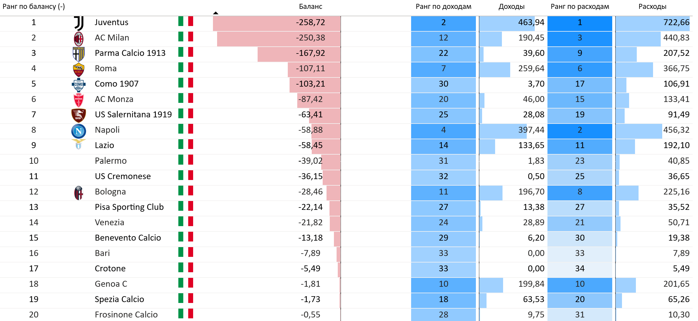 «Ювентус» абсолютный лидер по расходам на трансферы с 722 млн € и лидер по отрицательному балансу (-258 млн €), сопоставимый баланс только у «Милана» (-250 млн €). На третьем месте по худшему балансу – «Парма» (-167 млн евро, максимальная закупка в сезоне 20/21 на 104 млн €), а на 5 месте – «Комо» (-103 млн €, максимальная закупка в сезоне 24/25 на 97 млн €). Лидеры по зарабатку с трансферов – «Сассуоло» (137 млн €) и «Аталанта» (112 млн €). «Интер» зарабатывает на трансферах (+70 млн €).