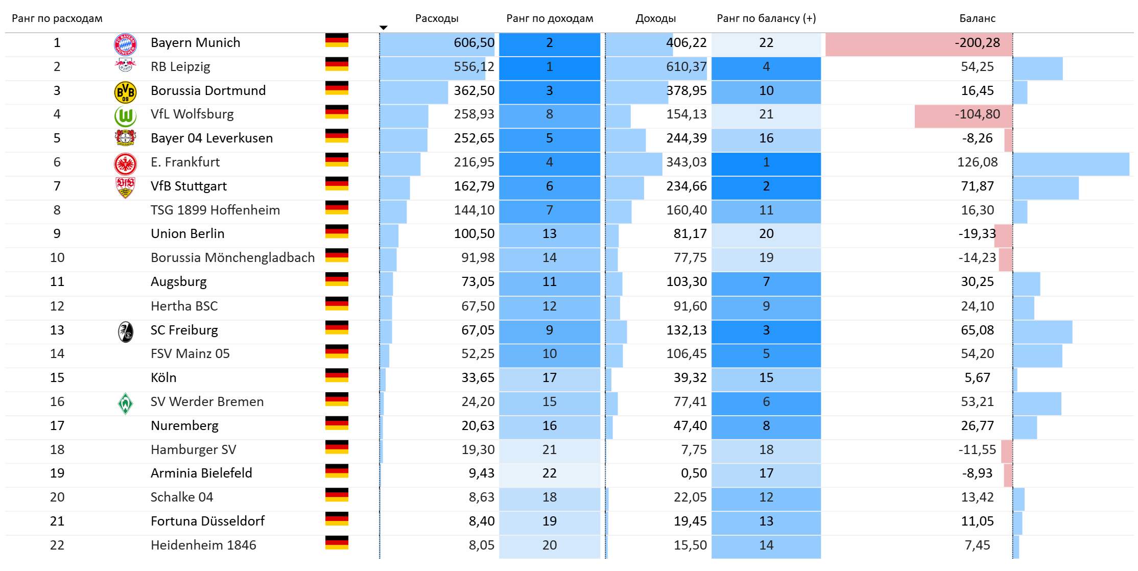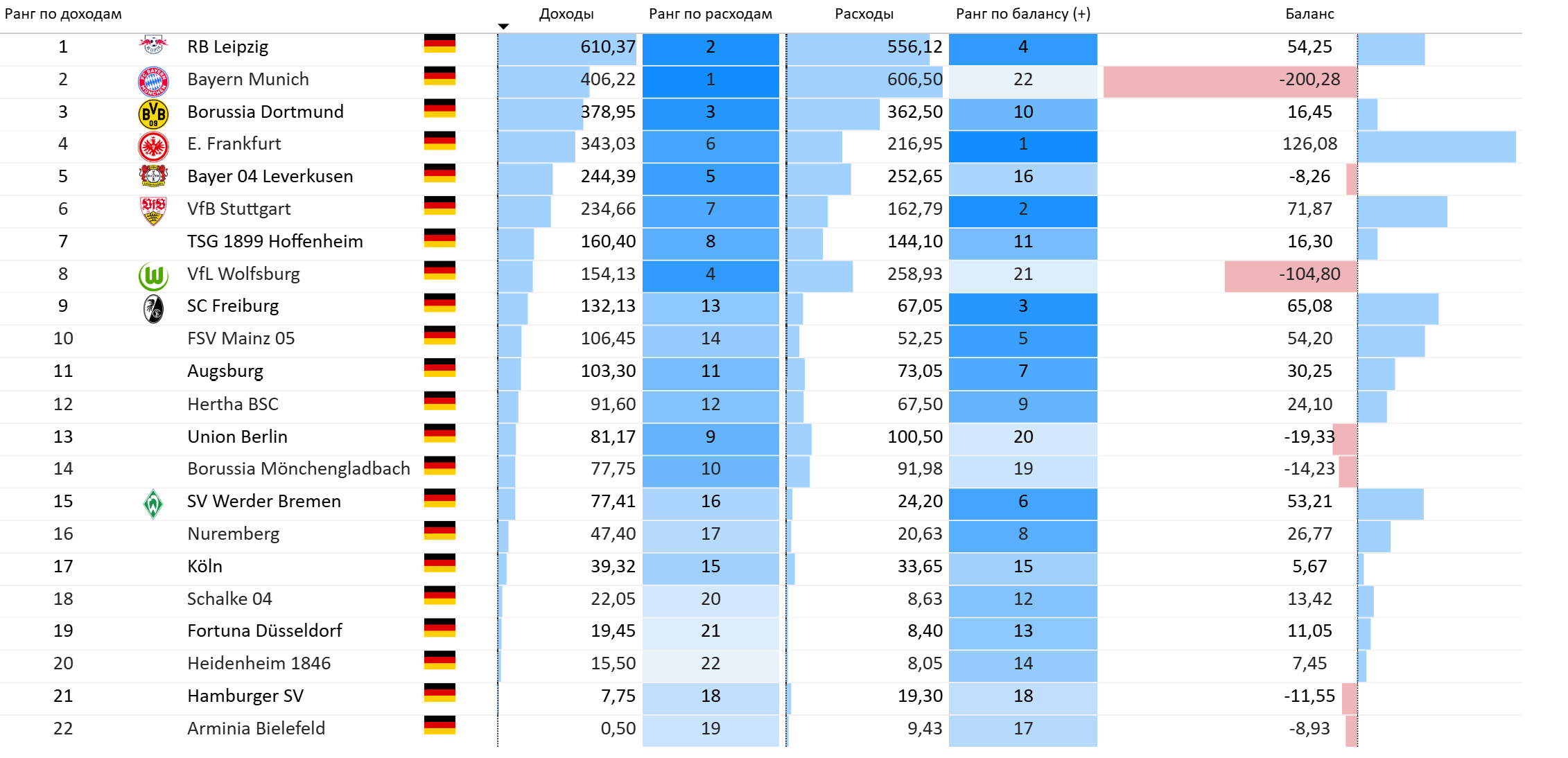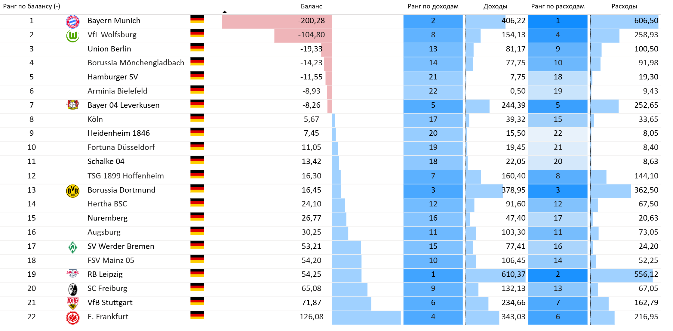 Только «Бавария» и «Вольфсбург» в большом минусе (-200 млн € и -104 млн €), а большая часть клубов зарабатывают на трансферах, лучший в этом «Айнтрахт Франкфурт» (+126 млн €).