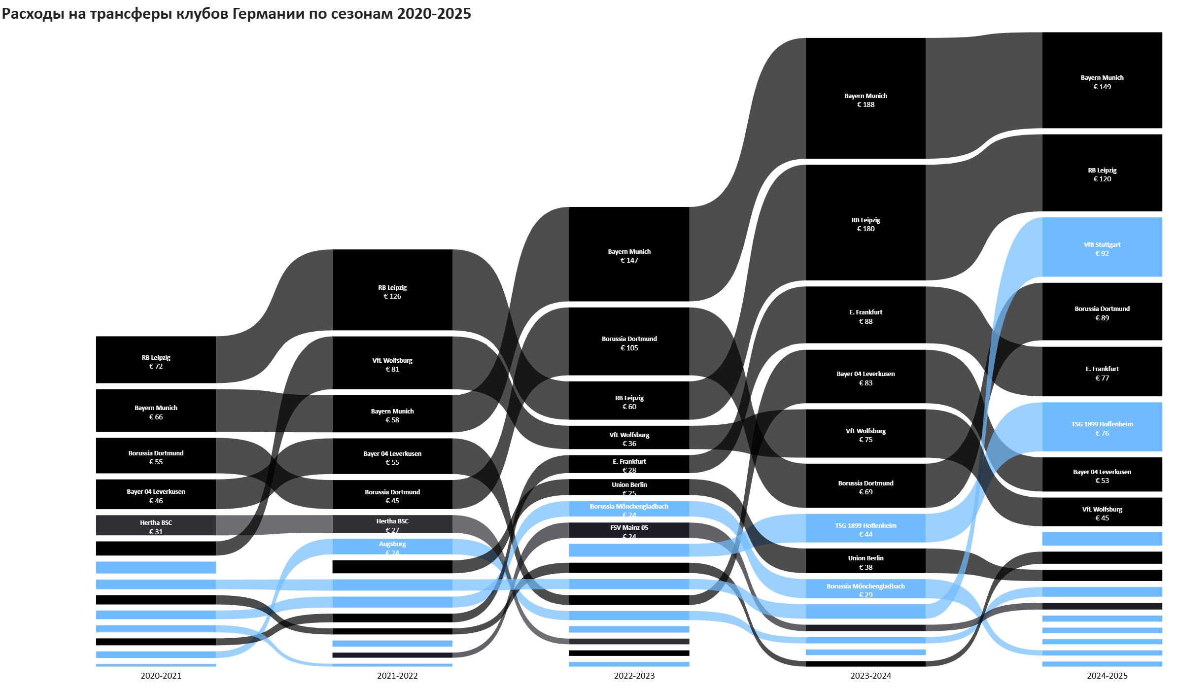 Изучаем суммы трансферов по клубам с сезона-20/21 по 24/25 по данным transfermarkt (до начала текущей трансферной кампании).