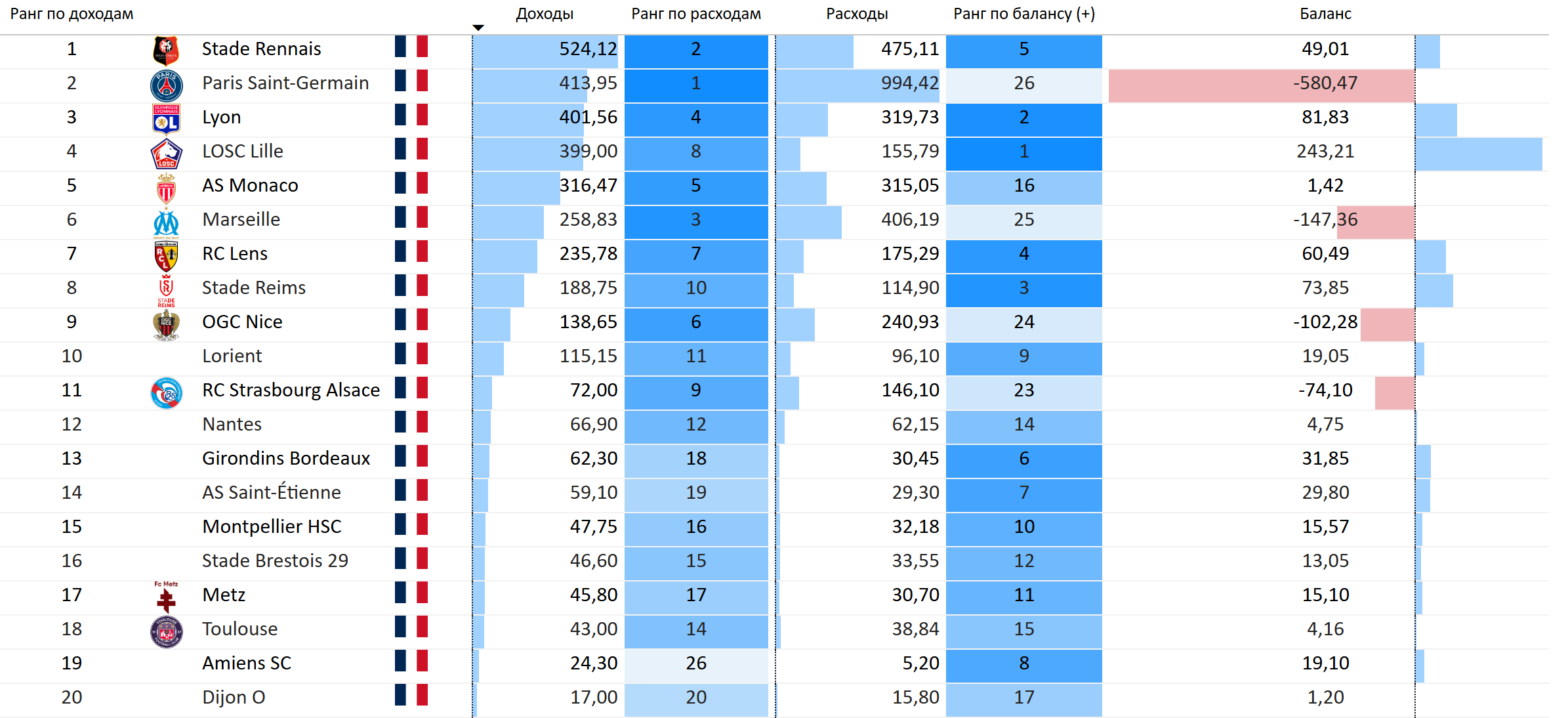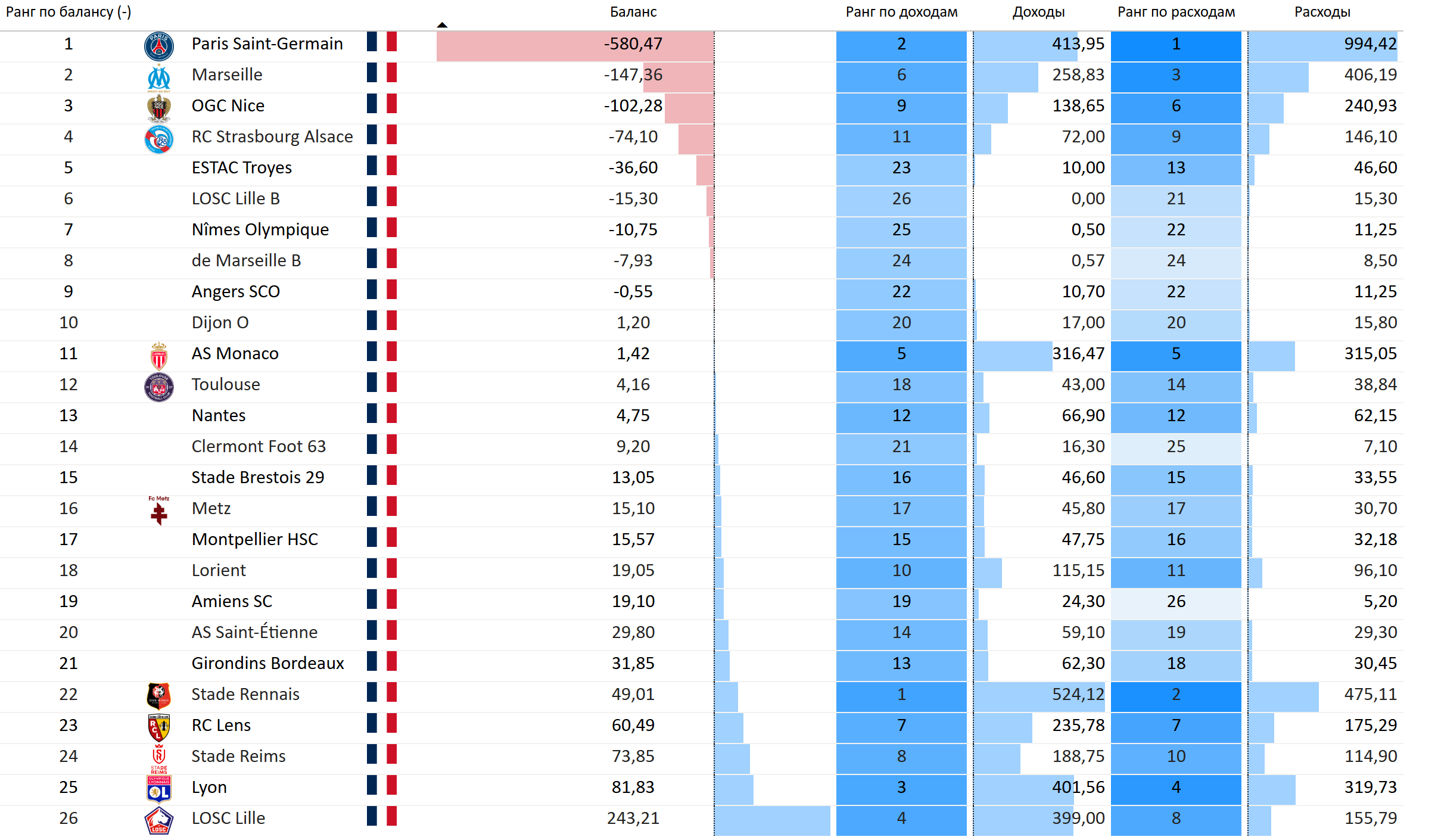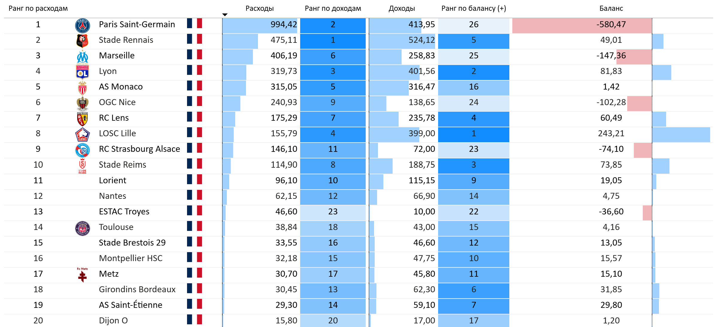 Во Франции по расходам «ПСЖ» дальше всех от 2 места в своей лиги среди топ-5 лиг (отрыв в 2 раза от «Марселя»), продают больше всех в «Ренне», а зарабатывают в «Лилле» (+243 млн €) – доходы клуба превышают расходы в 2.5 раза (это рекордное соотношение в топ-5 лигах).