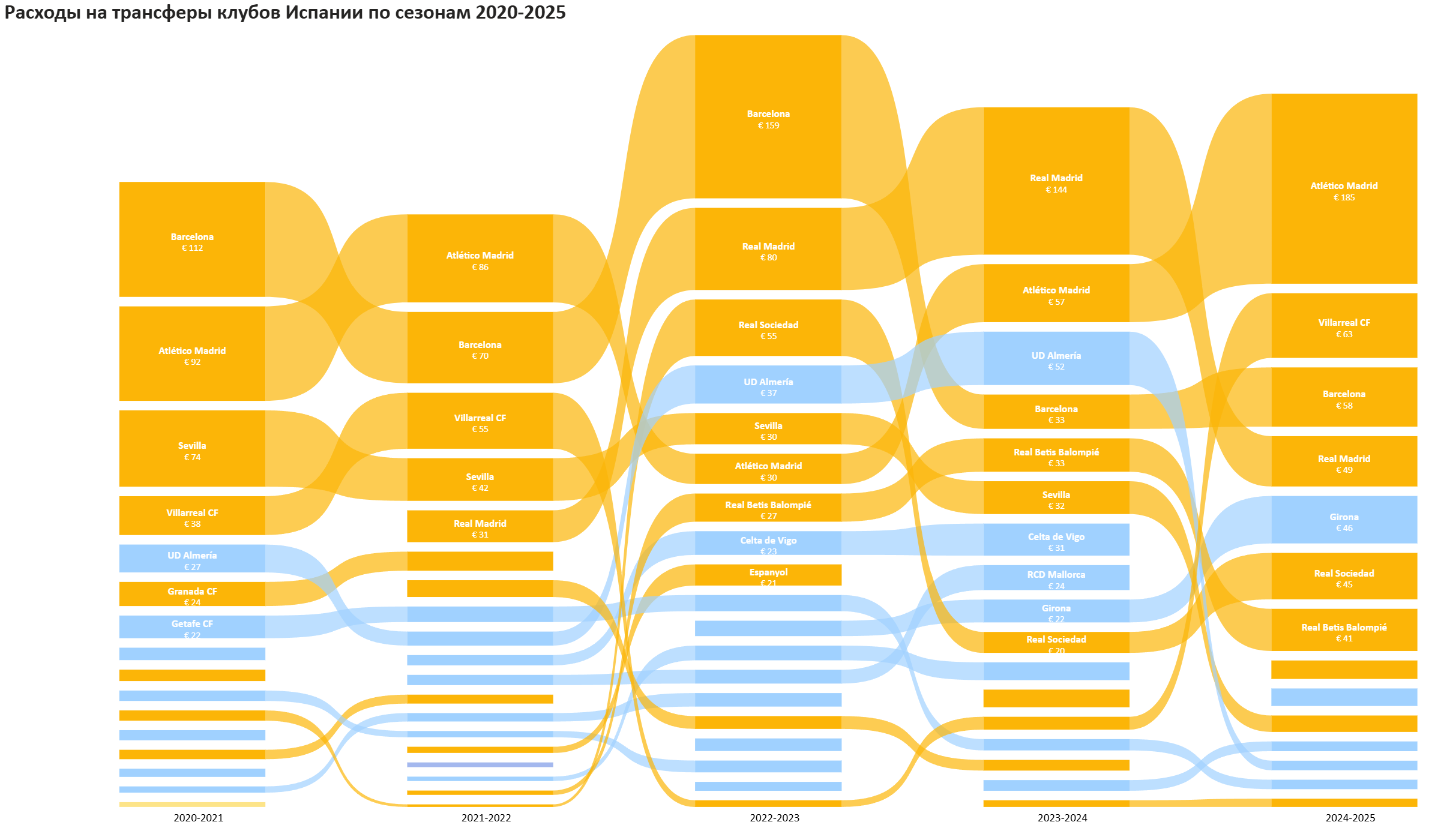 «Атлетико Мадрид» лидер по расходам и отрицательному балансу в Испании за последние 5 лет, особенно большая закупка у матрасников была в сезоне-24/25 – более 185 млн €. Больше всех продает «Барселона», а лидер по заработку «Реал Бетис».