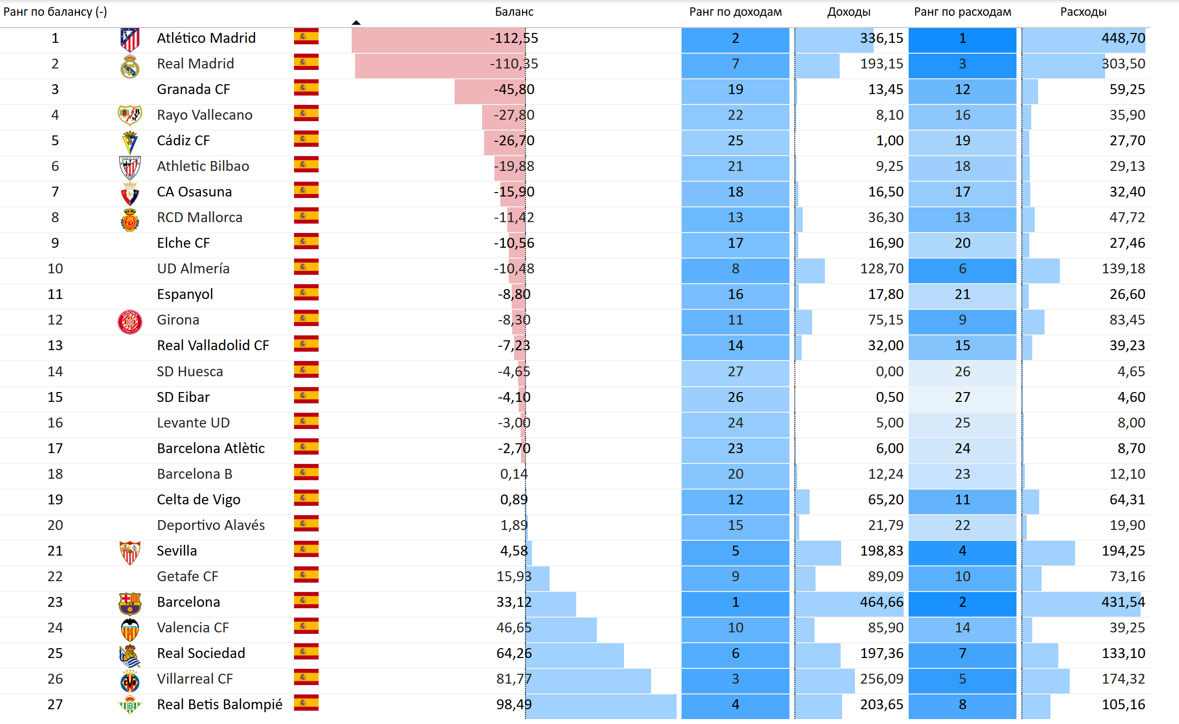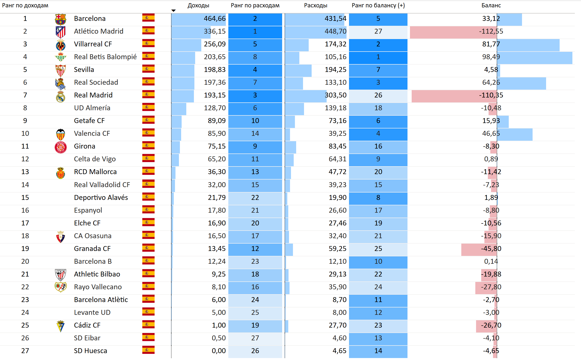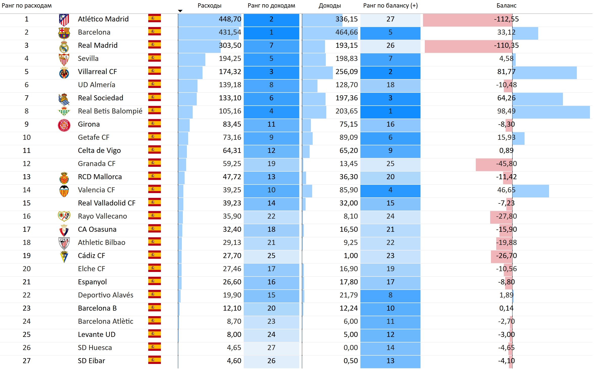 «Реал Мадрид» третий по расходам, седьмой по доходам и второй по отрицательному балансу с -110 млн €. «Барселона» на втором месте по расходам, лидер по доходам и пятый клуб Испании в рейтинге по лучшему балансу с +33 млн €.