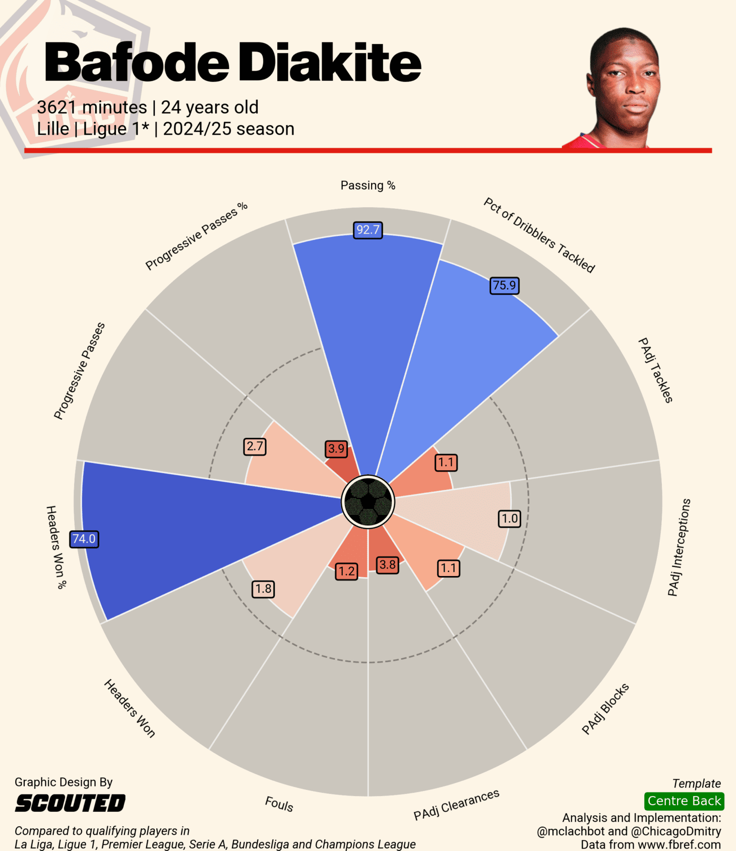 К объему действий в обороне Диаките могут быть вопросы, но важно понимать, что он играл в команде, старающейся контролировать мяч под 60% времени за матч. Хорош в воздухе при росте около 185 см, регулярно забивает на «стандартах» (10 голов в трех сезонах за «Лилль»), заметно реже среднего по меркам топ-лиг проигрывает единоборства, может сыграть на флангах обороны, если потребуется.