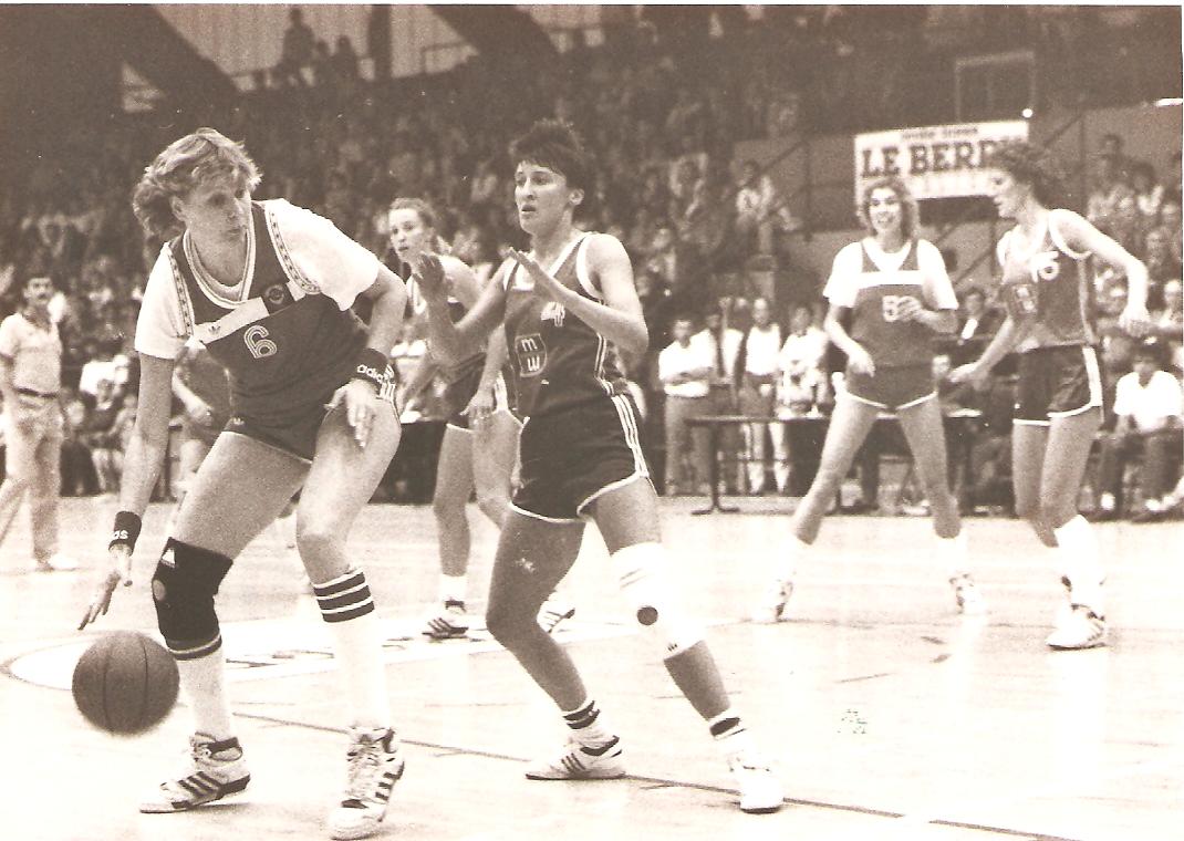 21 февраля 1985. Рига. Полуфинальный матч XXVII розыгрыша Кубка европейских чемпионов. ТТТ-«Даугава» – «Левски-Спартак» (София, Болгария) – 74:51. В центре – Ульяна Семенова, слева – Вита Элксне (№ 11)