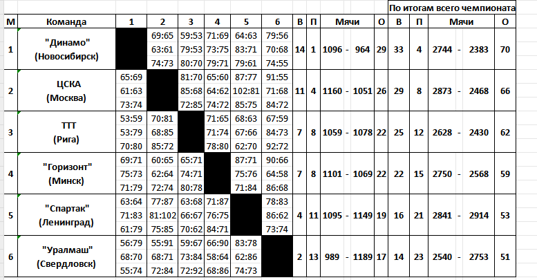 1. «Динамо» (Новосибирск) – 19 побед. 2–3. ЦСКА и ТТТ – по 18. 4. «Горизонт» – 15, 5–6. «Спартак» (Ленинград) и «Уралмаш» – по 12.