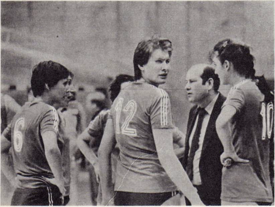 1985. LII чемпионат СССР. Тайм-аут новосибирского «Динамо»: Ирина Левченко (№ 6), Елена Капутская (№ 12) и Леонид Ячменев