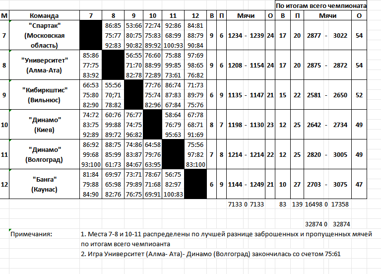 7. «Кибиркштис» – 9 побед. 8–9. «Университет» и «Спартак» (Московская обл.) – по 8. 10. «Динамо» (Волгоград) – 5. 11–12. «Динамо» (Киев) и «Банга» – по 4.