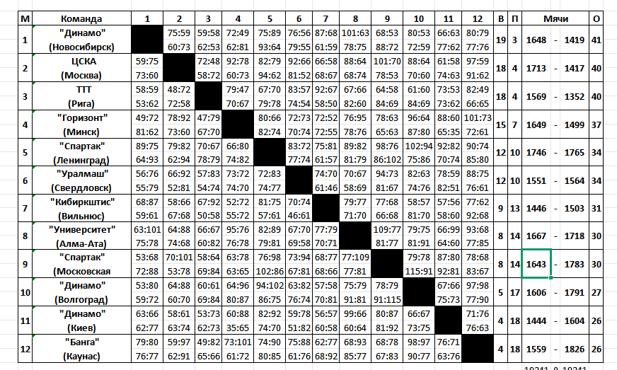 Положение команд после 17 матчей: 1. «Динамо» (Новосибирск) – 16 побед. 2. ЦСКА – 15. 3. ТТТ – 13. 4–5. «Уралмаш» и «Горизонт» – по 11. 6. «Спартак» (Ленинград) – 9. 7. «Кибиркштис» – 8. 8–9. «Университет» и «Спартак» (Московская обл.) – по 5. 10. «Динамо» (Киев) – 4. 11. «Динамо» (Волгоград) – 3. 12. «Банга» – 2.