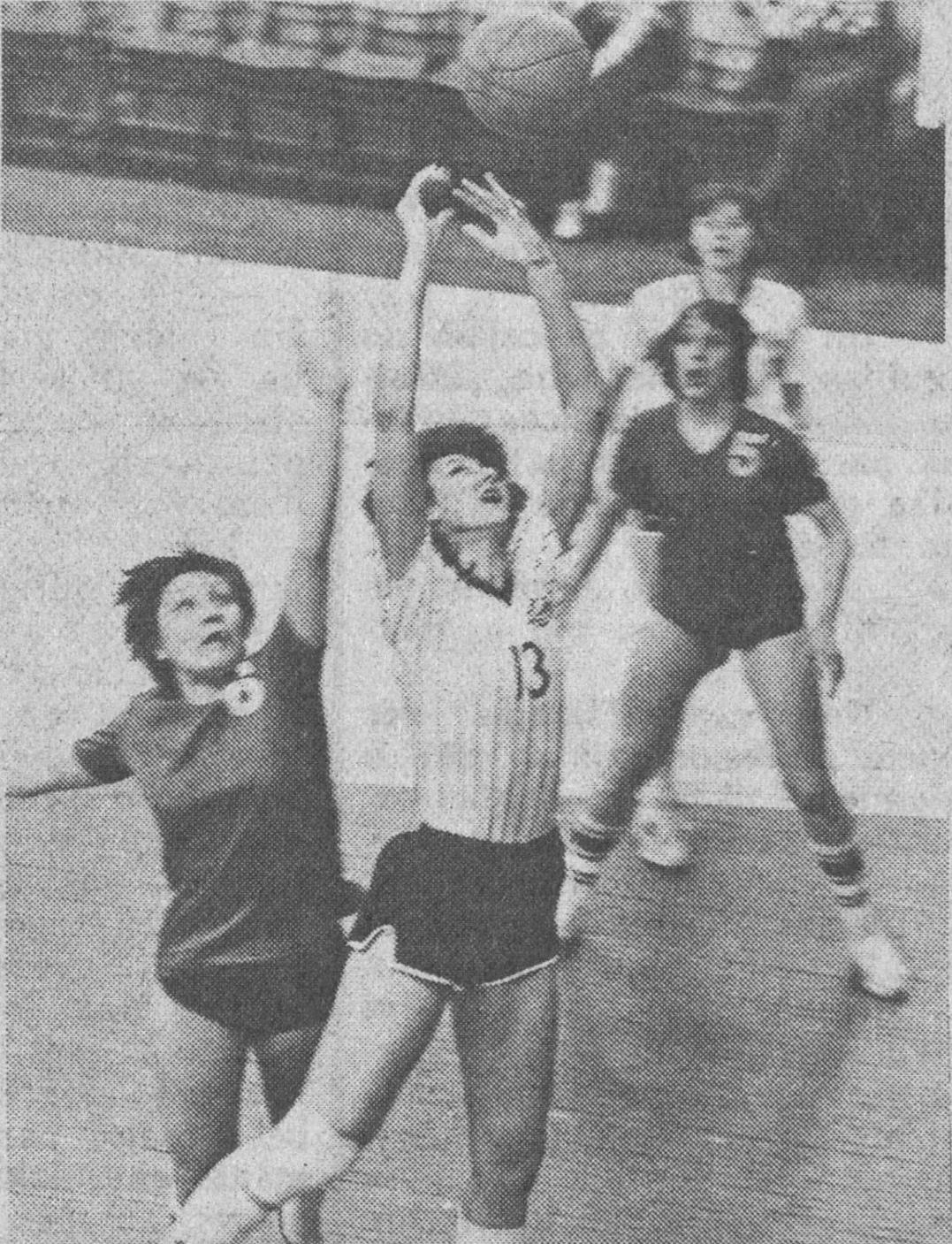 10 апреля 1985. Рига. Матч LII чемпионата СССР «Динамо» (Новосибирск) – «Спартак» (Ленинград) – 83:71. В борьбе за мяч динамовка Ирина Левченко (слева) и спартаковка Лариса Курикша (№ 13)