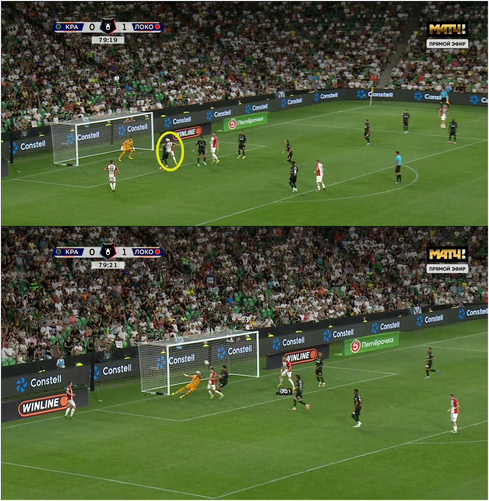 Батраков понимает это и ныряет в зону между центральным и крайним защитником. Отличие лишь в том, что здесь Алексей замыкал с лету. Даже передача в штрафную шла из той же точки.