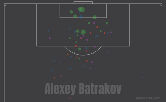 Батраков финиширует в штрафной, подбирает около/во вратарской и аккуратно кладет в угол издали. Если отбросить голы с пенальти, то распределение по зонам получится равномерным. Все это совмещается с пользой на стандартах (об этом ниже) и грандиозным влиянием на стиль.