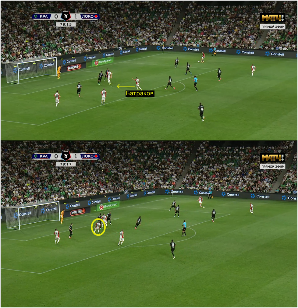 Оцените сами: Батраков поддерживает выпад вторым темпом и видит свободную зону, еще когда мяч на фланге у Максима Ненахова. На первом скрине видно, как Алексей поднимает руку, на втором – как занимает позицию.