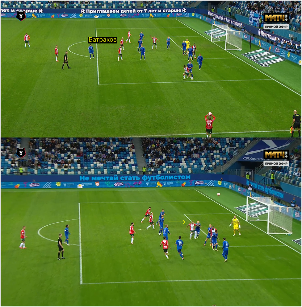 Батраков отвечал за второй темп после выносов: бил с подборов либо сохранял владение для вывода на удар/кросс. Так положил с правого угла «Оренбургу» (4:2) в прошлом сезоне после выигранного подбора Артема Карпукаса.