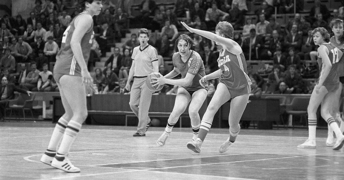 26 марта 1986. Рига. Суперфинальный матч LIII чемпионата СССР ТТТ — «Динамо» (Новосибирск) — 59:81. Ульяна Семенова ставит заслон и освобождает пространство для Инги Бриеде