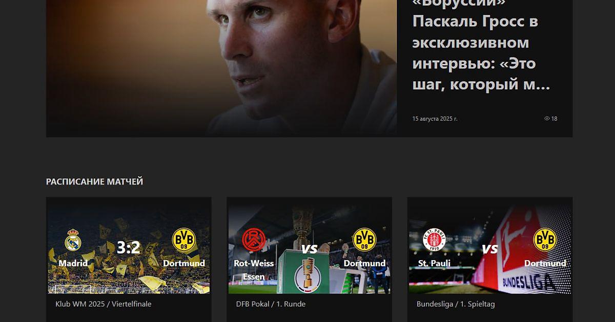 Всем поклонникам дортмундской «Боруссии» большой привет! После нескольких лет перерыва снова открылся сайт https://bvb-news.ru/ с чатом. Все болельщики команды могут зарегистрироваться на новом сайте, принять участие в общении и ознакомиться с последними новостями.