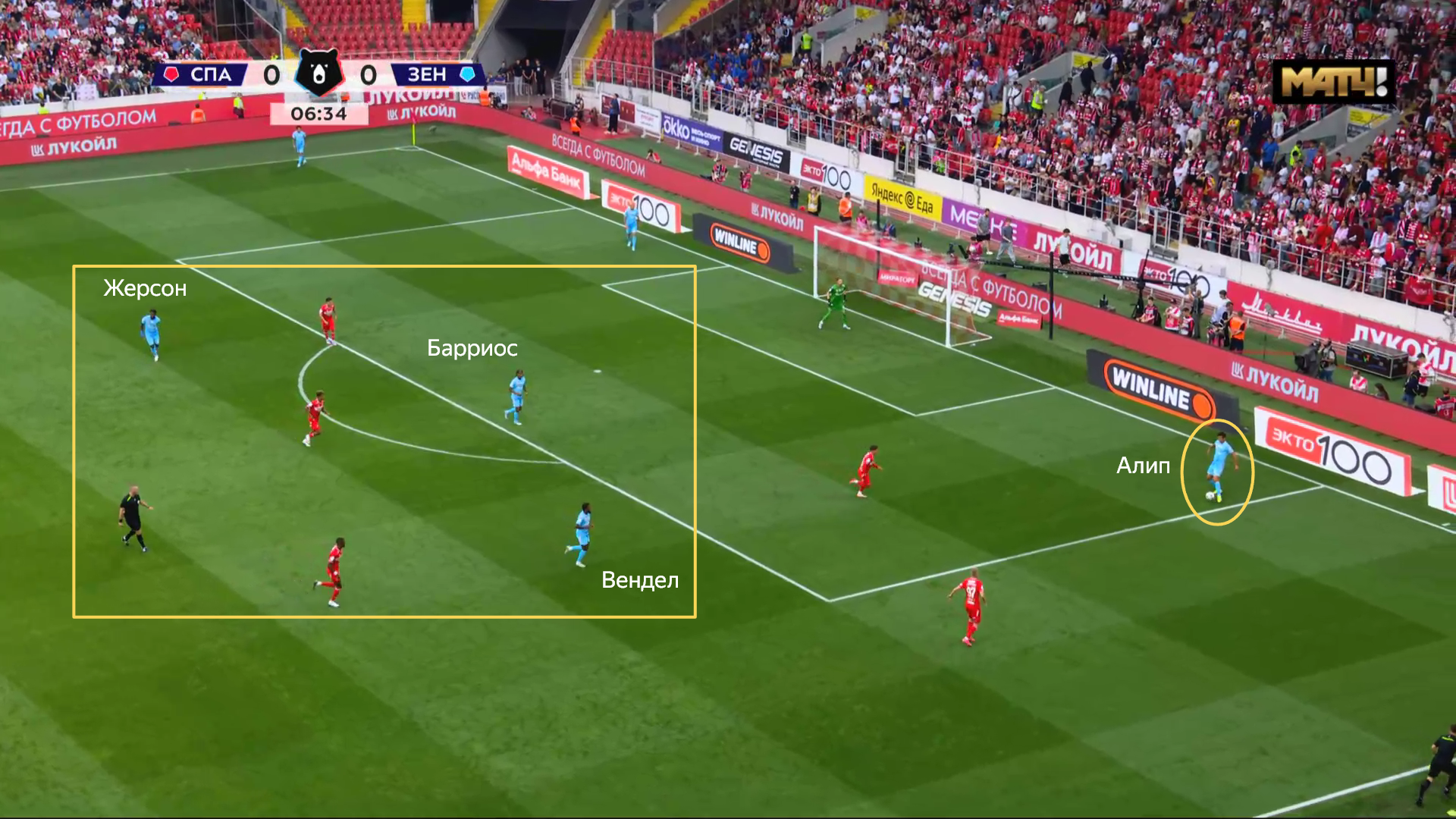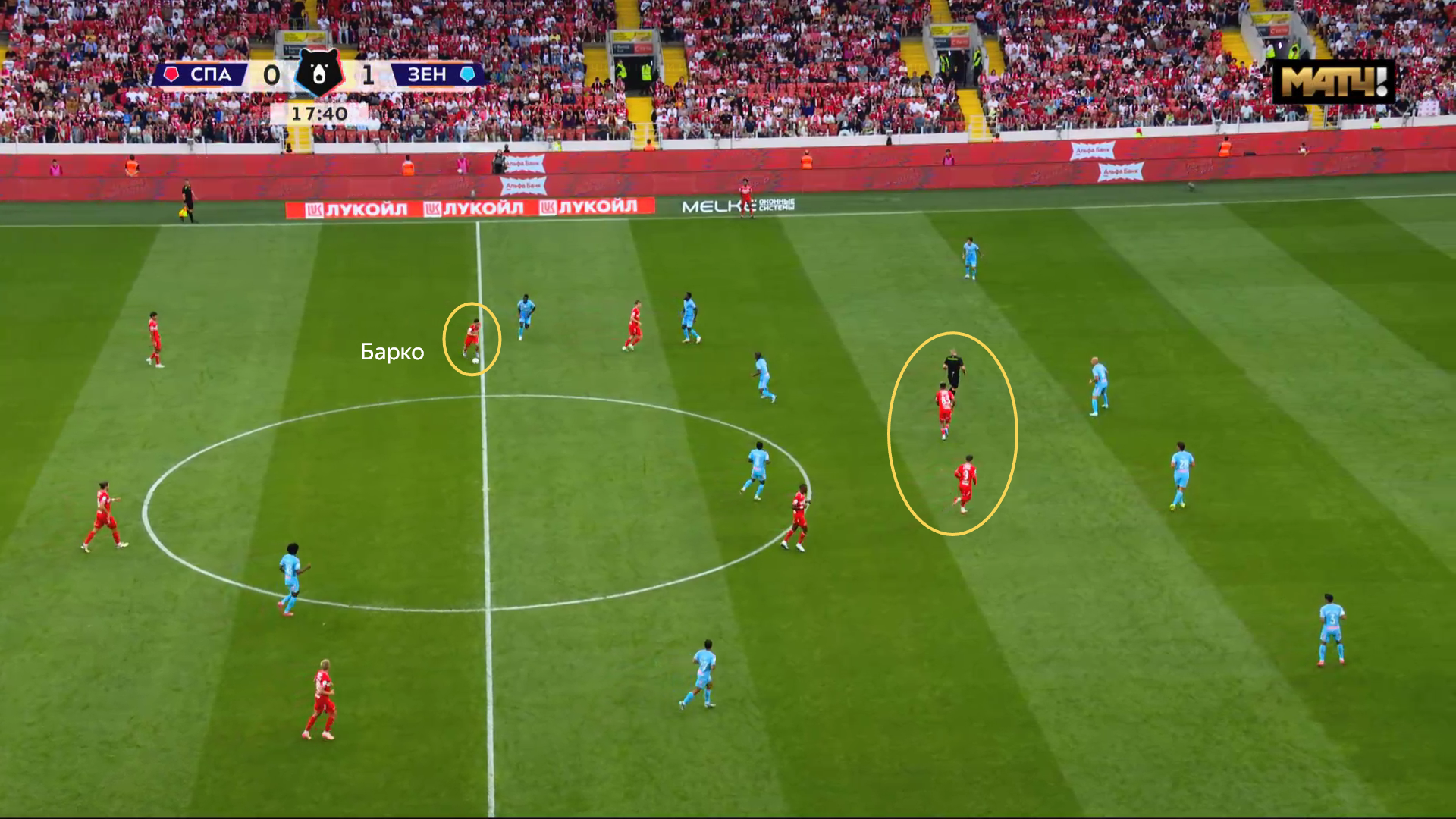 Здесь гости выстраиваются в оборонительную схему 4-5-1. При этом игроки «Зенита» действуют очень пассивно. Барко получает свободу на мяче в центре поля и огромное свободное пространство для движения вперед.