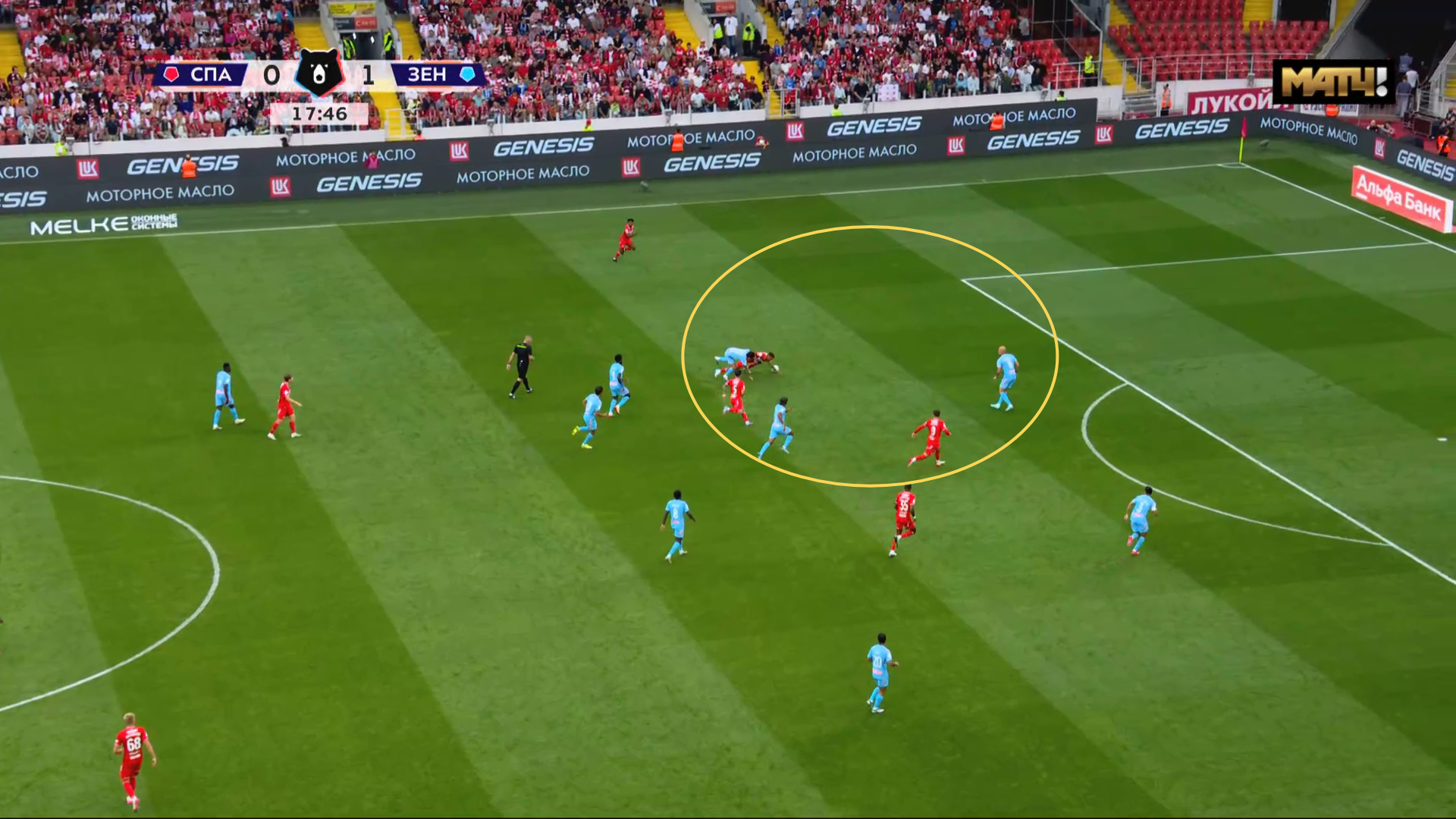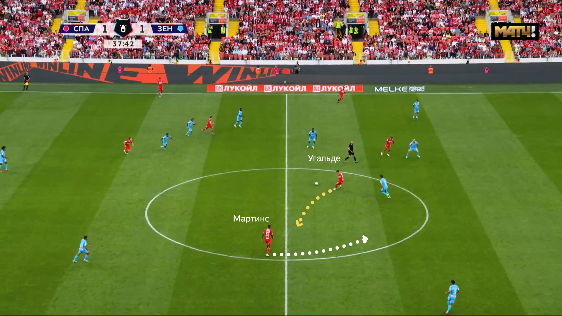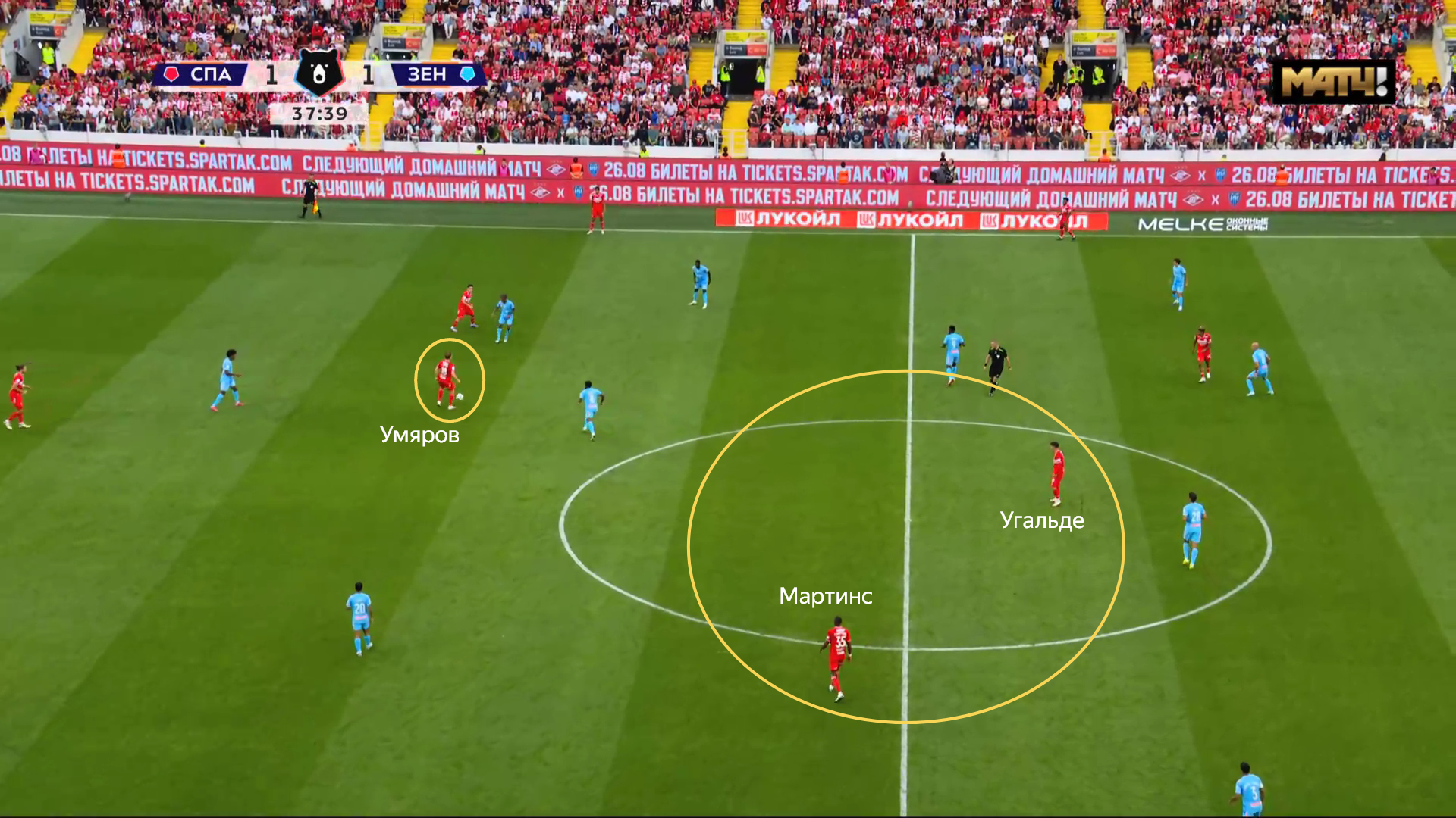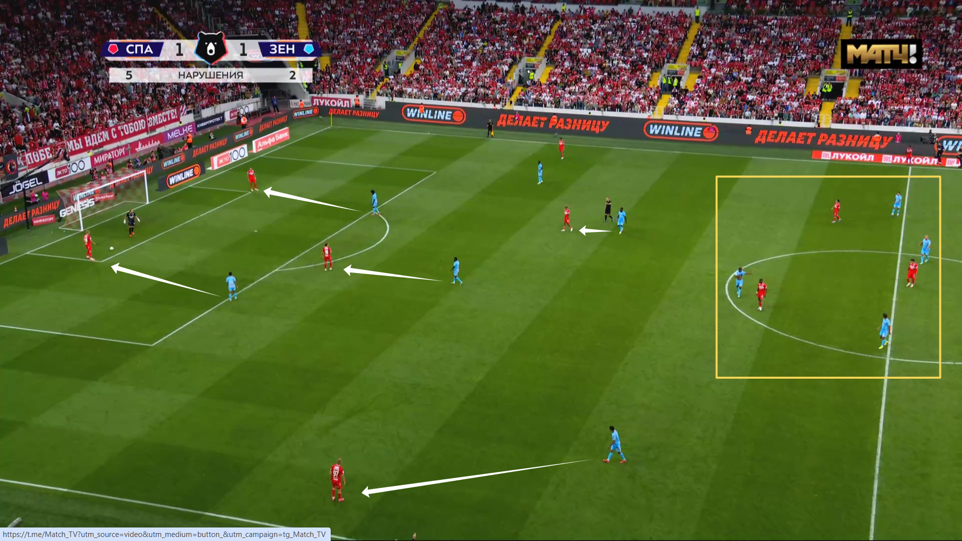 В данном эпизоде схожий принцип. Умяров на мяче получает свободу для паса. Выше располагаются абсолютно свободные партнеры. В результате «Спартак» снова пользуется ситуацией и уходит в атаку.